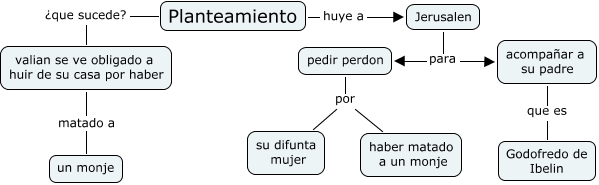 Este Cmap, tiene información relacionada con: plantea, Jerusalen para pedir perdon, pedir perdon por haber matado a un monje, pedir perdon por su difunta mujer, Jerusalen para acompañar a su padre, Planteamiento ¿que sucede? valian se ve obligado a huir de su casa por haber, acompañar a su padre que es Godofredo de Ibelin, Planteamiento huye a Jerusalen, valian se ve obligado a huir de su casa por haber matado a un monje