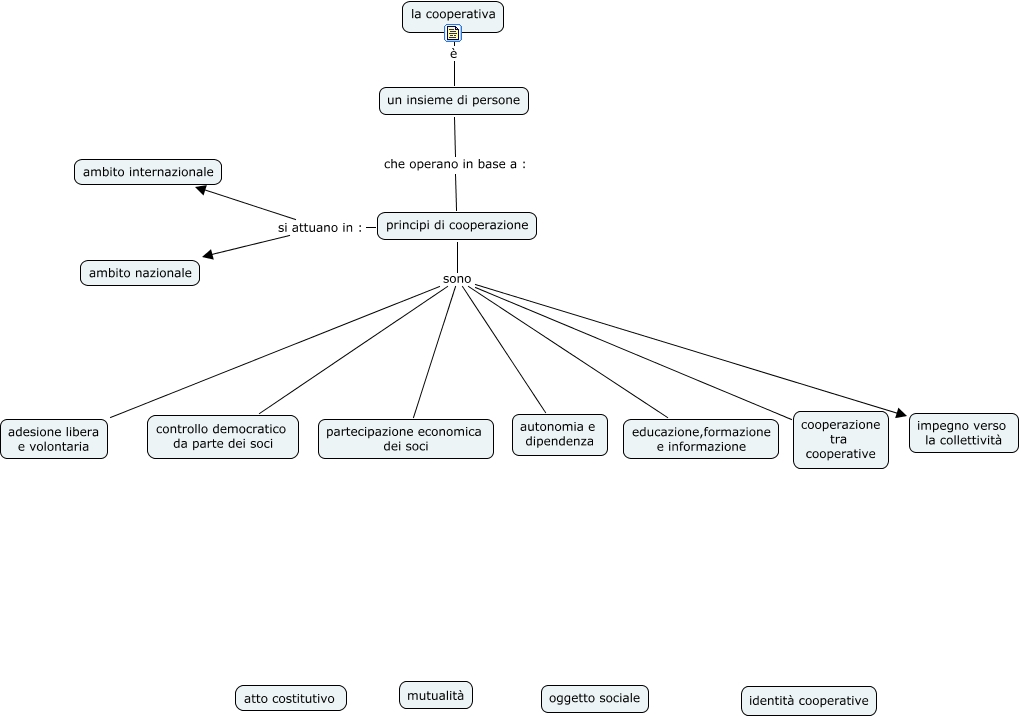 Questa Cmap, creata con IHMC CmapTools, contiene informazioni relative a: de masi 2 o 3 mappa coop, principi di cooperazione sono adesione libera e volontaria, principi di cooperazione sono cooperazione tra cooperative, principi di cooperazione sono controllo democratico da parte dei soci, principi di cooperazione sono partecipazione economica dei soci, la cooperativa è un insieme di persone, principi di cooperazione sono educazione,formazione e informazione, principi di cooperazione si attuano in : ambito nazionale, un insieme di persone che operano in base a : principi di cooperazione, principi di cooperazione sono autonomia e dipendenza, principi di cooperazione sono impegno verso la collettività, principi di cooperazione si attuano in : ambito internazionale