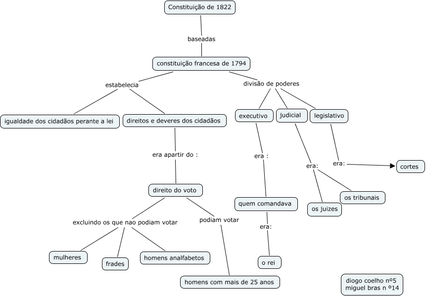 Esse mapa conceitual, produzido no IHMC CmapTools, tem a informação relacionada a: Sem título 1, direito do voto podiam votar homens com mais de 25 anos, constituição francesa de 1794 estabelecia igualdade dos cidadãos perante a lei, quem comandava era: o rei, direito do voto excluindo os que nao podiam votar homens analfabetos, direito do voto excluindo os que nao podiam votar mulheres, legislativo era: cortes, constituição francesa de 1794 divisão de poderes judicial, constituição francesa de 1794 divisão de poderes executivo, constituição francesa de 1794 estabelecia direitos e deveres dos cidadãos, direito do voto excluindo os que nao podiam votar frades, constituição francesa de 1794 divisão de poderes legislativo, Constituição de 1822 baseadas constituição francesa de 1794, executivo era : quem comandava, judicial era: os juizes, direitos e deveres dos cidadãos era apartir do : direito do voto, judicial era: os tribunais