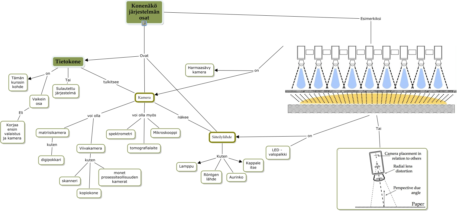 This Concept Map, created with IHMC CmapTools, has information related to: KN järjestelmän osat, Säteilylähde Kuten Aurinko, on LED - valopalkki, Viivakamera kuten kopiokone, Vaikein osa Eli Korjaa ensin valaistus ja kamera, Kamera voi olla Viivakamera, Säteilylähde Kuten Röntgen lähde, Viivakamera kuten skanneri, Kamera voi olla myös Mikroskooppi, Konenäkö järjestelmän osat Ovat Tietokone, Tietokone tulkitsee Kamera, Tietokone on Tämän kurssin kohde, Säteilylähde Kuten Kappale itse, matriisikamera kuten digipokkari, Tietokone on Vaikein osa, Kamera voi olla matriisikamera, Konenäkö järjestelmän osat Esimerkiksi, Kamera voi olla myös spektrometri, on Kamera, Säteilylähde Kuten Lamppu, Kamera näkee Säteilylähde