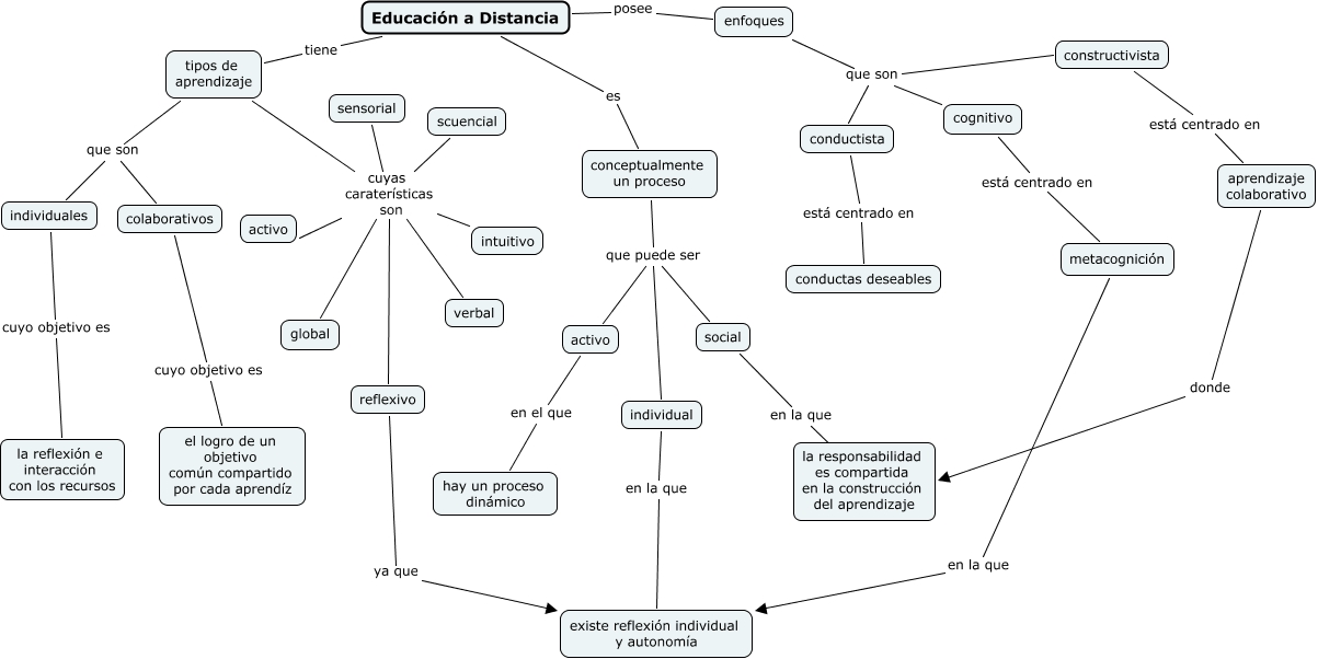 Esse mapa conceitual, produzido no IHMC CmapTools, tem a informação relacionada a: EaD, tipos de aprendizaje cuyas caraterísticas son scuencial, tipos de aprendizaje cuyas caraterísticas son intuitivo, conceptualmente un proceso que puede ser social, enfoques que son cognitivo, constructivista está centrado en aprendizaje colaborativo, tipos de aprendizaje cuyas caraterísticas son reflexivo, Educación a Distancia tiene tipos de aprendizaje, individuales cuyo objetivo es la reflexión e interacción con los recursos, tipos de aprendizaje que son colaborativos, Educación a Distancia posee enfoques, tipos de aprendizaje cuyas caraterísticas son verbal, tipos de aprendizaje cuyas caraterísticas son activo, tipos de aprendizaje cuyas caraterísticas son sensorial, cognitivo está centrado en metacognición, conceptualmente un proceso que puede ser individual, reflexivo ya que existe reflexión individual y autonomía, individual en la que existe reflexión individual y autonomía, conductista está centrado en conductas deseables, social en la que ????, conceptualmente un proceso que puede ser activo