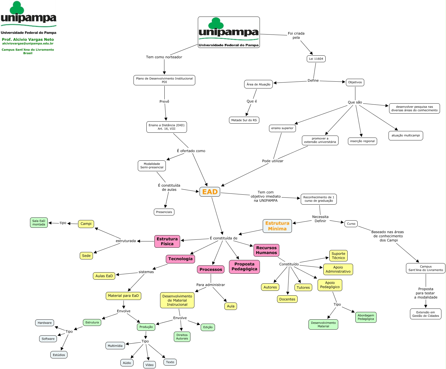 This Concept Map, created with IHMC CmapTools, has information related to: EAD - Alcivio, Objetivos Que são promover a extensão universitária, Estrutura Mínima É constituída de Estrutura Física, Desenvolvimento de Material Instrucional Envolve Direitos Autorais, Processos Para administrar Aula, Estrutura Tipo Hardware, Objetivos Que são ensino superior, Reconhecimento de 1 curso de graduação Necessita Definir Estrutura Mínima, Tem como norteador Plano de Desenvolvimento Institucional PDI, Plano de Desenvolvimento Institucional PDI Prevê Ensino a Distância (EAD) Art. 16, VIII, Produção Tipo Multimídia, Recursos Humanos Constituído Suporte Técnico, Material para EaD Envolve Estrutura, Recursos Humanos Constituído Docentes, Curso Baseado nas áreas de conhecimento dos Campi Campus Sant'Ana do Livramento, Estrutura Mínima É constituída de Processos, Lei 11604 Define Objetivos, Tecnologia sistemas Aulas EaD, Desenvolvimento de Material Instrucional Envolve Edição, Foi criada pela Lei 11604, Reconhecimento de 1 curso de graduação Necessita Definir Curso