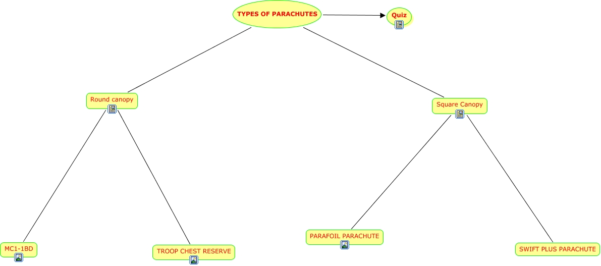 This Concept Map, created with IHMC CmapTools, has information related to: CINDY, Square Canopy PARAFOIL PARACHUTE, TYPES OF PARACHUTES Round canopy, Round canopy TROOP CHEST RESERVE, TYPES OF PARACHUTES Square Canopy, Square Canopy SWIFT PLUS PARACHUTE, TYPES OF PARACHUTES Quiz, Round canopy MC1-1BD