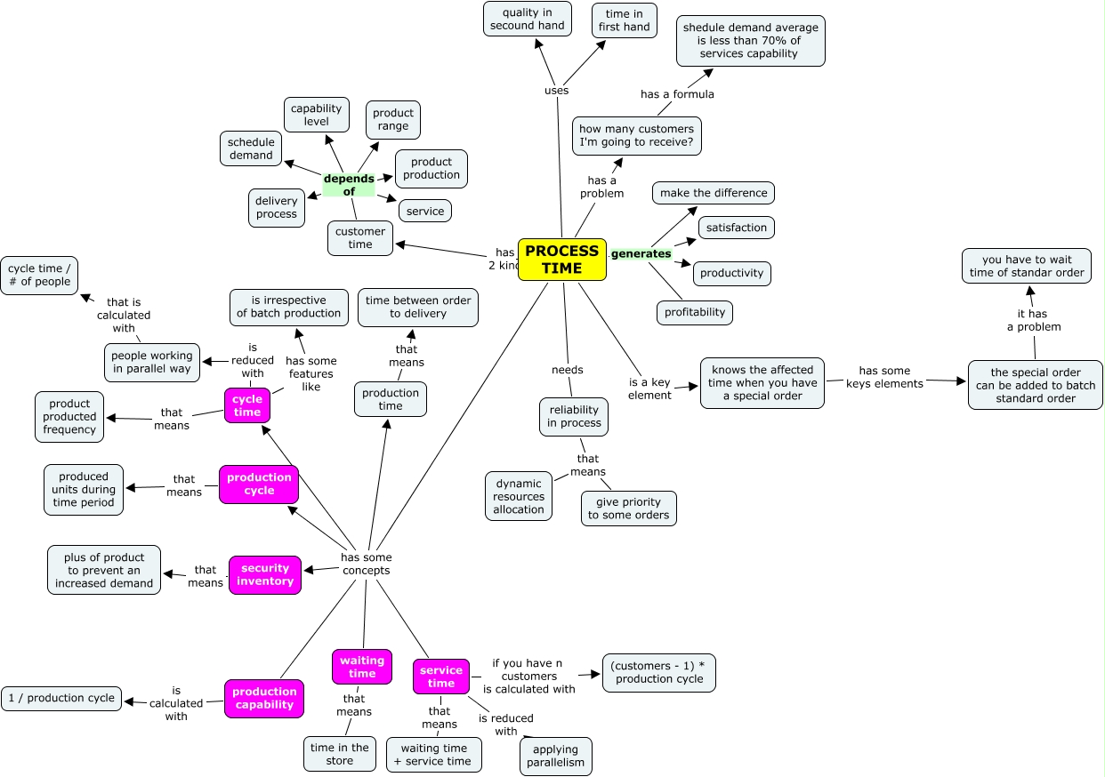 Este Cmap, tiene información relacionada con: 6-Process time, PROCESS TIME is a key element knows the affected time when you have a special order, PROCESS TIME needs reliability in process, the special order can be added to batch standard order it has a problem you have to wait time of standar order, PROCESS TIME has a problem how many customers I'm going to receive?, PROCESS TIME generates profitability, PROCESS TIME generates make the difference, security inventory that means plus of product to prevent an increased demand, PROCESS TIME has some concepts service time, people working in parallel way that is calculated with cycle time / # of people, service time that means waiting time + service time, PROCESS TIME has some concepts production capability, customer time depends of capability level, customer time depends of product production, reliability in process that means give priority to some orders, customer time depends of schedule demand, production cycle that means produced units during time period, PROCESS TIME generates productivity, service time if you have n customers is calculated with (customers - 1) * production cycle, PROCESS TIME has 2 kind customer time, reliability in process that means dynamic resources allocation