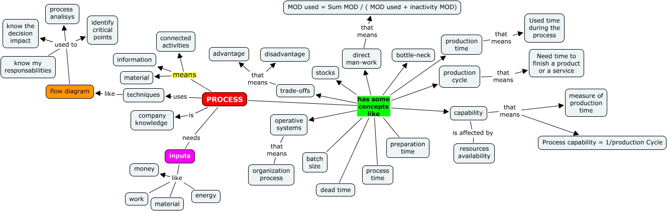Este Cmap, tiene información relacionada con: 4-Process, inputs like work, inputs like material, capability is affected by resources availability, trade-offs that means disadvantage, PROCESS has some concepts like operative systems, PROCESS means information, capability that means measure of production time, PROCESS has some concepts like stocks, direct man-work that means MOD used = Sum MOD / ( MOD used + inactivity MOD), flow diagram used to process analisys, capability that means Process capability = 1/production Cycle, PROCESS has some concepts like preparation time, PROCESS has some concepts like dead time, PROCESS means material, flow diagram used to know the decision impact, inputs like energy, trade-offs that means advantage, operative systems that means organization process, PROCESS means connected activities, flow diagram used to know my responsabilities
