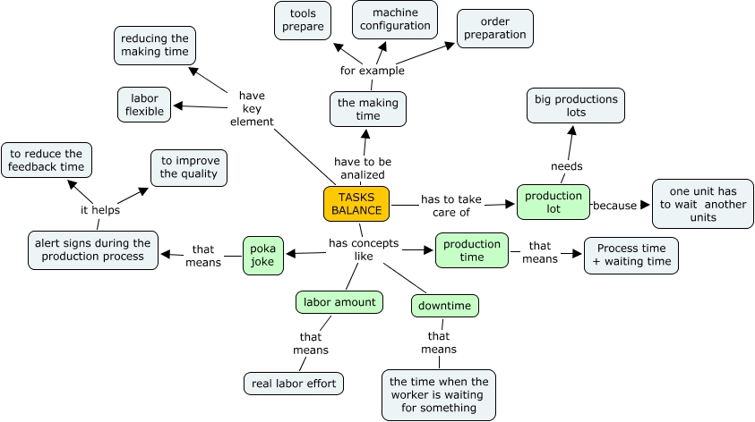 Este Cmap, tiene información relacionada con: 8-Tasks balance, alert signs during the production process it helps to reduce the feedback time, poka joke that means alert signs during the production process, production lot because one unit has to wait another units, the making time for example tools prepare, TASKS BALANCE has concepts like downtime, production time that means Process time + waiting time, TASKS BALANCE has concepts like production time, the making time for example order preparation, alert signs during the production process it helps to improve the quality, labor amount that means real labor effort, downtime that means the time when the worker is waiting for something, TASKS BALANCE has to take care of production lot, TASKS BALANCE have key element labor flexible, TASKS BALANCE has concepts like labor amount, TASKS BALANCE have key element reducing the making time, TASKS BALANCE have to be analized the making time, TASKS BALANCE has concepts like poka joke, the making time for example machine configuration, production lot needs big productions lots