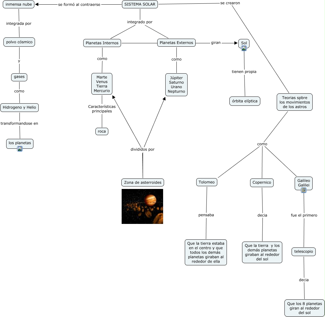 Este Cmap, tiene información relacionada con: Mapa conceptual, Teorias spbre los movimientos de los astros como Tolomeo, Tolomeo pensaba Que la tierra estaba en el centro y que todos los demás planetas giraban al rededor de ella, SISTEMA SOLAR integrado por Planetas Internos, Teorias spbre los movimientos de los astros como Galileo Galilei, inmensa nube integrada por polvo cósmico, Galileo Galilei fue el primero telescopio, Planetas Externos como Júpiter Saturno Urano Nepturno, Marte Venus Tierra Mercurio Características principales roca, Sol tienen propia órbita elíptica, Teorias spbre los movimientos de los astros como Copernico, gases como Hidrogeno y Helio, SISTEMA SOLAR se formó al contraerse inmensa nube, Zona de asterroides divididos por Júpiter Saturno Urano Nepturno, Planetas Internos como Marte Venus Tierra Mercurio, telescopio decia Que los 8 planetas giran al rededor del sol, Hidrogeno y Helio transformandose en los planetas, polvo cósmico y gases, SISTEMA SOLAR integrado por Planetas Externos, Zona de asterroides Marte Venus Tierra Mercurio, Planetas Internos giran Sol