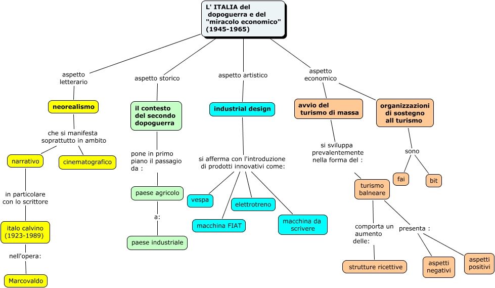 Questa Cmap, creata con IHMC CmapTools, contiene informazioni relative a: MAPPA NUOVA D'ANGELO-CORRETTA, neorealismo che si manifesta soprattutto in ambito narrativo, L' ITALIA del dopoguerra e del "miracolo economico" (1945-1965) aspetto economico organizzazioni di sostegno all turismo, organizzazioni di sostegno all turismo sono bit, turismo balneare comporta un aumento delle: strutture ricettive, avvio del turismo di massa si sviluppa prevalentemente nella forma del : turismo balneare, L' ITALIA del dopoguerra e del "miracolo economico" (1945-1965) aspetto letterario neorealismo, industrial design si afferma con l'introduzione di prodotti innovativi come: macchina da scrivere, paese agricolo a: paese industriale, italo calvino (1923-1989) nell'opera: Marcovaldo, industrial design si afferma con l'introduzione di prodotti innovativi come: elettrotreno, turismo balneare presenta : aspetti negativi, industrial design si afferma con l'introduzione di prodotti innovativi come: vespa, il contesto del secondo dopoguerra pone in primo piano il passagio da : paese agricolo, industrial design si afferma con l'introduzione di prodotti innovativi come: macchina FIAT, L' ITALIA del dopoguerra e del "miracolo economico" (1945-1965) aspetto artistico industrial design, narrativo in particolare con lo scrittore italo calvino (1923-1989), turismo balneare presenta : aspetti positivi, L' ITALIA del dopoguerra e del "miracolo economico" (1945-1965) aspetto storico il contesto del secondo dopoguerra, organizzazioni di sostegno all turismo sono fai, L' ITALIA del dopoguerra e del "miracolo economico" (1945-1965) aspetto economico avvio del turismo di massa