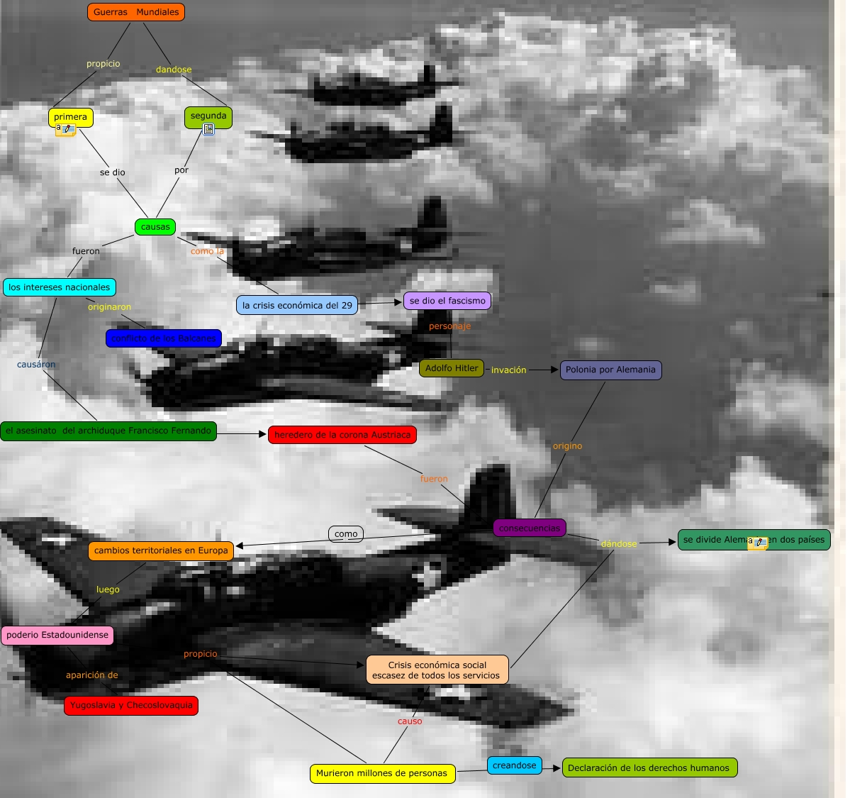 Este Cmap, tiene información relacionada con: historia I guerras mundiales, el asesinato del archiduque Francisco Fernando ???? heredero de la corona Austriaca, Guerras Mundiales propicio primera, poderio Estadounidense propicio Murieron millones de personas, la crisis económica del 29 ???? se dio el fascismo, Crisis económica social escasez de todos los servicios causo Murieron millones de personas, Guerras Mundiales dandose segunda, heredero de la corona Austriaca fueron consecuencias, consecuencias dándose se divide Alemania en dos países, causas fueron los intereses nacionales, causas como la la crisis económica del 29, consecuencias dándose Crisis económica social escasez de todos los servicios, consecuencias cambios territoriales en Europa, segunda por causas, los intereses nacionales causáron el asesinato del archiduque Francisco Fernando, primera se dio causas, cambios territoriales en Europa luego poderio Estadounidense, poderio Estadounidense aparición de Yugoslavia y Checoslovaquia, Polonia por Alemania origino consecuencias, se dio el fascismo personaje Adolfo Hitler, Adolfo Hitler invación Polonia por Alemania