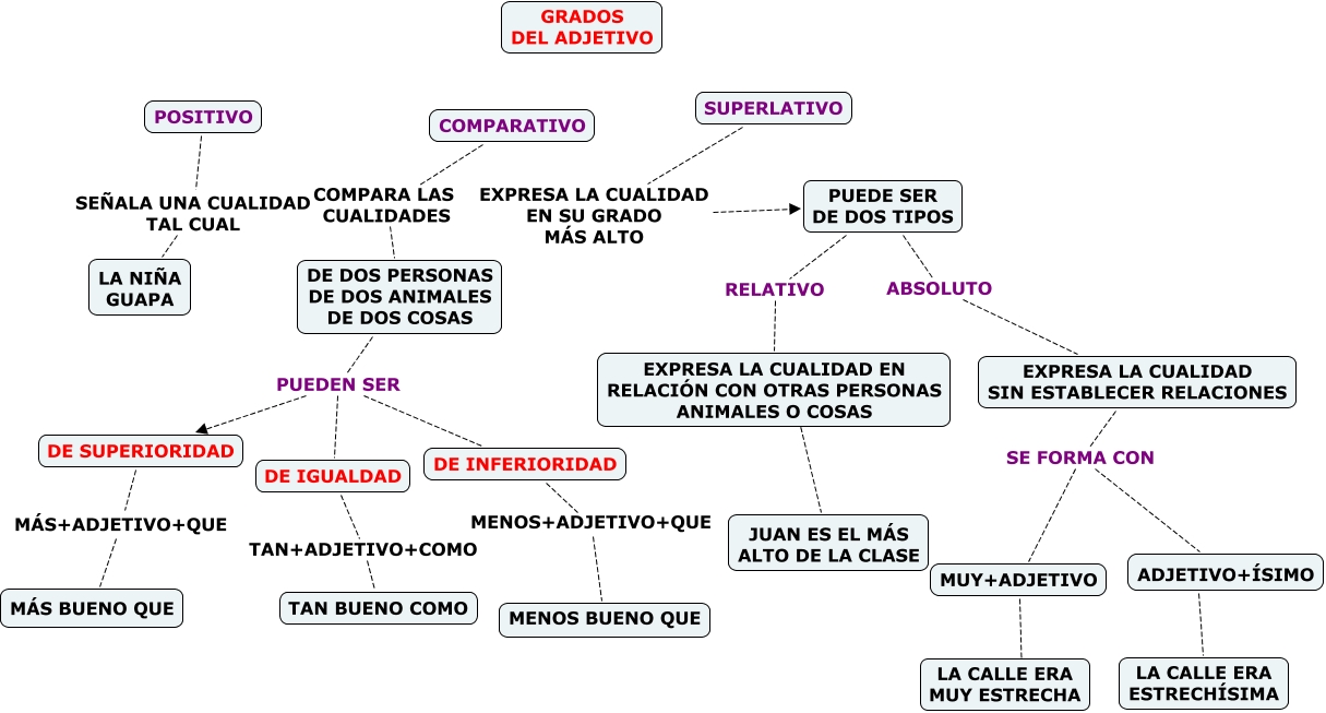 Este Cmap, tiene información relacionada con: GRADOS DEL ADJETIVO, DE IGUALDAD TAN+ADJETIVO+COMO TAN BUENO COMO, MUY+ADJETIVO ???? LA CALLE ERA MUY ESTRECHA, POSITIVO SEÑALA UNA CUALIDAD TAL CUAL LA NIÑA GUAPA, SUPERLATIVO EXPRESA LA CUALIDAD EN SU GRADO MÁS ALTO PUEDE SER DE DOS TIPOS, EXPRESA LA CUALIDAD EN RELACIÓN CON OTRAS PERSONAS ANIMALES O COSAS ???? JUAN ES EL MÁS ALTO DE LA CLASE, DE DOS PERSONAS DE DOS ANIMALES DE DOS COSAS PUEDEN SER DE IGUALDAD, PUEDE SER DE DOS TIPOS RELATIVO EXPRESA LA CUALIDAD EN RELACIÓN CON OTRAS PERSONAS ANIMALES O COSAS, DE DOS PERSONAS DE DOS ANIMALES DE DOS COSAS PUEDEN SER DE INFERIORIDAD, DE DOS PERSONAS DE DOS ANIMALES DE DOS COSAS PUEDEN SER DE SUPERIORIDAD, ADJETIVO+ÍSIMO ???? LA CALLE ERA ESTRECHÍSIMA, PUEDE SER DE DOS TIPOS ABSOLUTO EXPRESA LA CUALIDAD SIN ESTABLECER RELACIONES, COMPARATIVO COMPARA LAS CUALIDADES DE DOS PERSONAS DE DOS ANIMALES DE DOS COSAS, EXPRESA LA CUALIDAD SIN ESTABLECER RELACIONES SE FORMA CON MUY+ADJETIVO, DE SUPERIORIDAD MÁS+ADJETIVO+QUE MÁS BUENO QUE, EXPRESA LA CUALIDAD SIN ESTABLECER RELACIONES SE FORMA CON ADJETIVO+ÍSIMO, DE INFERIORIDAD MENOS+ADJETIVO+QUE MENOS BUENO QUE