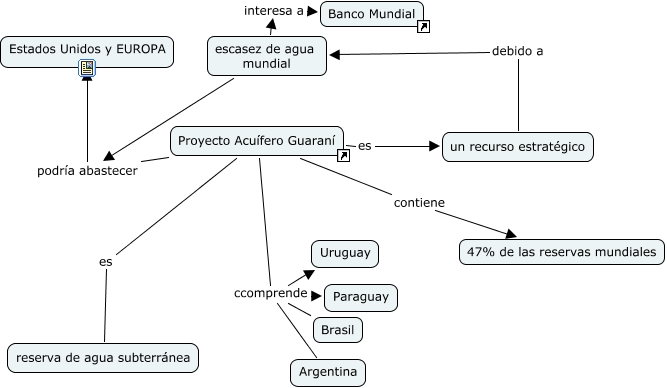 Este Cmap, tiene información relacionada con: 14. El acuífero Guaraní, Proyecto Acuífero Guaraní es reserva de agua subterránea, Proyecto Acuífero Guaraní ccomprende Argentina, Proyecto Acuífero Guaraní contiene 47% de las reservas mundiales, Proyecto Acuífero Guaraní ccomprende Paraguay, Proyecto Acuífero Guaraní es un recurso estratégico, escasez de agua mundial podría abastecer Estados Unidos y EUROPA, Proyecto Acuífero Guaraní ccomprende Uruguay, escasez de agua mundial interesa a Banco Mundial, Proyecto Acuífero Guaraní podría abastecer Estados Unidos y EUROPA, Proyecto Acuífero Guaraní ccomprende Brasil, un recurso estratégico debido a escasez de agua mundial