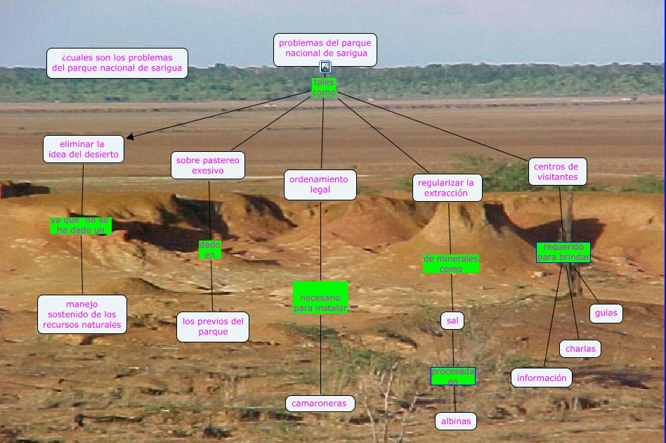 Este Cmap, tiene información relacionada con: 12. Problemas del parque nacional de Sarigua, ordenamiento legal necesario para instalar camaroneras, problemas del parque nacional de sarigua tales como eliminar la idea del desierto, centros de visitantes requerido para brindar información, problemas del parque nacional de sarigua tales como ordenamiento legal, problemas del parque nacional de sarigua tales como centros de visitantes, centros de visitantes requerido para brindar guias, problemas del parque nacional de sarigua tales como regularizar la extracción, centros de visitantes requerido para brindar charlas, problemas del parque nacional de sarigua tales como sobre pastereo exesivo, sal procesada en albinas, sobre pastereo exesivo dado en los previos del parque, regularizar la extracción de minerales como sal, eliminar la idea del desierto ya que no se ha dado un manejo sostenido de los recursos naturales