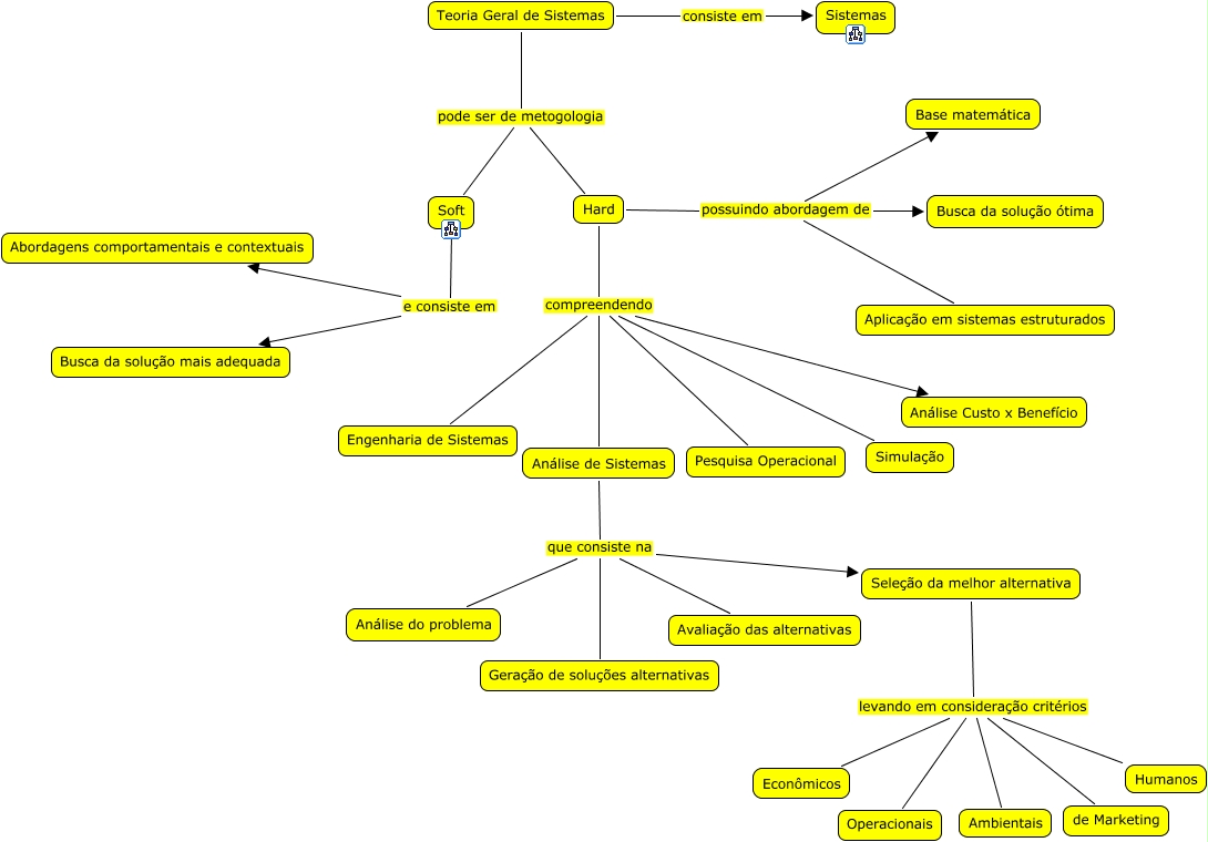 Esse mapa conceitual, produzido no IHMC CmapTools, tem a informação relacionada a: Teoria Geral de Sistemas, Hard compreendendo Pesquisa Operacional, Seleção da melhor alternativa levando em consideração critérios Humanos, Hard possuindo abordagem de Base matemática, Hard possuindo abordagem de Busca da solução ótima, Soft e consiste em Abordagens comportamentais e contextuais, Teoria Geral de Sistemas pode ser de metogologia Hard, Análise de Sistemas que consiste na Análise do problema, Hard compreendendo Simulação, Soft e consiste em Busca da solução mais adequada, Seleção da melhor alternativa levando em consideração critérios Econômicos, Teoria Geral de Sistemas consiste em Sistemas, Hard compreendendo Análise de Sistemas, Teoria Geral de Sistemas pode ser de metogologia Soft, Seleção da melhor alternativa levando em consideração critérios Ambientais, Análise de Sistemas que consiste na Avaliação das alternativas, Hard compreendendo Análise Custo x Benefício, Análise de Sistemas que consiste na Seleção da melhor alternativa, Hard compreendendo Engenharia de Sistemas, Análise de Sistemas que consiste na Geração de soluções alternativas, Hard possuindo abordagem de Aplicação em sistemas estruturados
