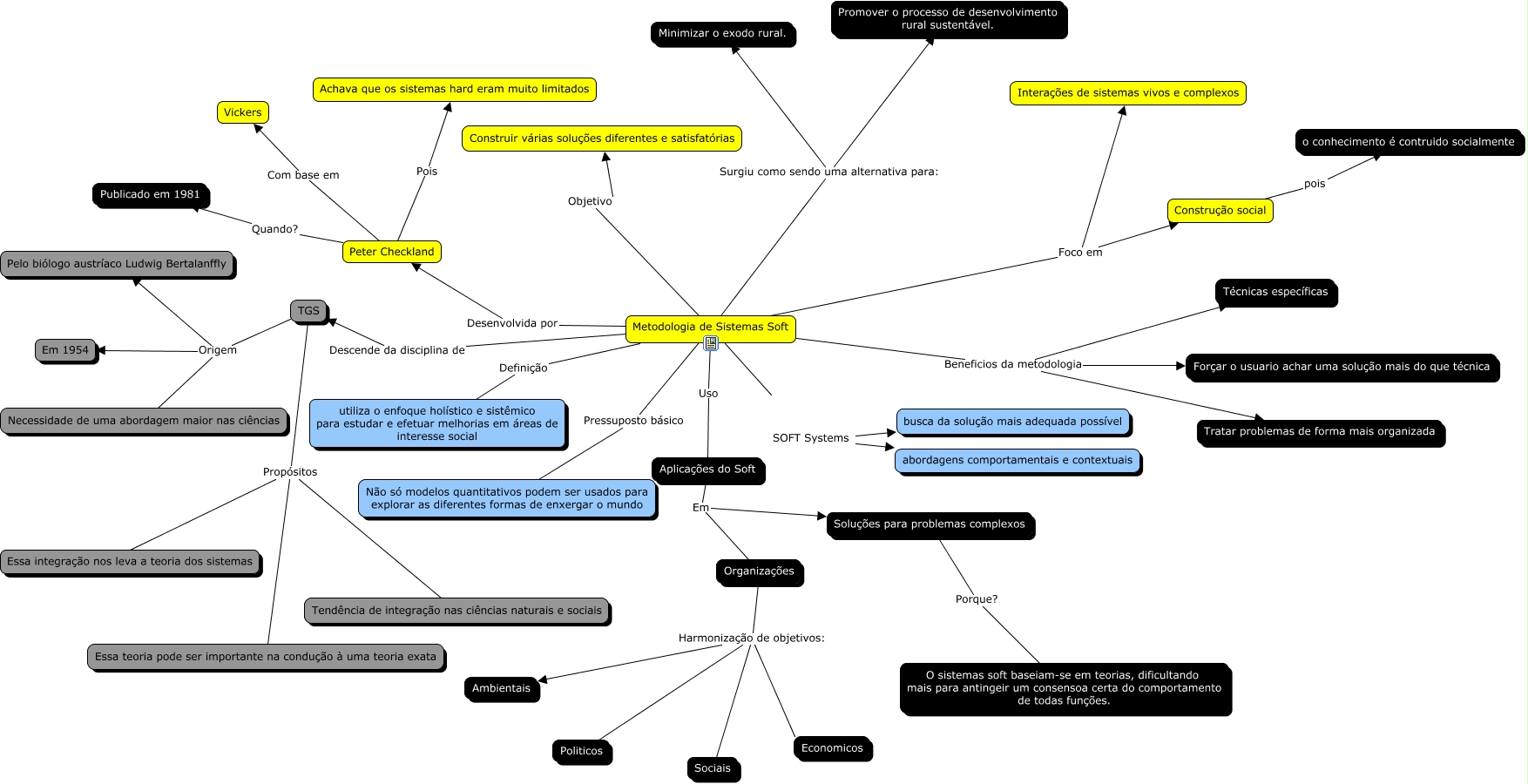 Esse mapa conceitual, produzido no IHMC CmapTools, tem a informação relacionada a: Metodologia de Sistemas Soft, Organizações Harmonização de objetivos: Politicos, Aplicações do Soft Em Soluções para problemas complexos, Metodologia de Sistemas Soft Descende da disciplina de TGS, Metodologia de Sistemas Soft Foco em Construção social, Peter Checkland Quando? Publicado em 1981, Organizações Harmonização de objetivos: Sociais, TGS Propósitos Tendência de integração nas ciências naturais e sociais, Metodologia de Sistemas Soft Definição utiliza o enfoque holístico e sistêmico para estudar e efetuar melhorias em áreas de interesse social, Organizações Harmonização de objetivos: Ambientais, TGS Propósitos Essa teoria pode ser importante na condução à uma teoria exata, Metodologia de Sistemas Soft Desenvolvida por Peter Checkland, Metodologia de Sistemas Soft Beneficios da metodologia Forçar o usuario achar uma solução mais do que técnica, TGS Origem Em 1954, Metodologia de Sistemas Soft Objetivo Construir várias soluções diferentes e satisfatórias, Soluções para problemas complexos Porque? O sistemas soft baseiam-se em teorias, dificultando mais para antingeir um consensoa certa do comportamento de todas funções., Metodologia de Sistemas Soft Uso Aplicações do Soft, TGS Origem Necessidade de uma abordagem maior nas ciências, Metodologia de Sistemas Soft SOFT Systems busca da solução mais adequada possível, Aplicações do Soft Em Organizações, Metodologia de Sistemas Soft Foco em Interações de sistemas vivos e complexos