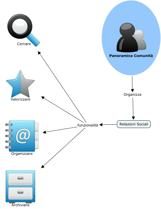 Questa Cmap, creata con IHMC CmapTools, contiene informazioni relative a: 1.2 Panoramica Comunità, Relazioni Sociali funzionalità Organizzare, Relazioni Sociali funzionalità Cercare, Relazioni Sociali funzionalità Archiviare, Relazioni Sociali funzionalità Valorizzare, Panoramica Comunità Organizza Relazioni Sociali