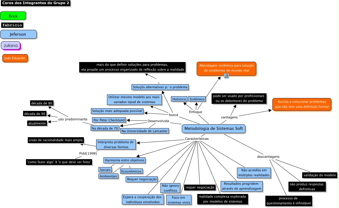 Esse mapa conceitual, produzido no IHMC CmapTools, tem a informação relacionada a: Cores Integrantes & SSM Map, Interpreta problema de diversas formas Pidd(1998) 'como fazer algo’ X 'o que deve ser feito', Metodologia de Sistemas Soft busca Soluçõs alternativas p/ o problema, Na década de 70 uso predominante década de 90, Metodologia de Sistemas Soft vantagens Auxilia a solucionar problemas que não tem uma definição formal, Metodologia de Sistemas Soft Características Foco em sistemas vivos, Metodologia de Sistemas Soft Características Não acredita em múltiplas realidades, Metodologia de Sistemas Soft desvantagens validação do modelo, Metodologia de Sistemas Soft Características Espera a cooperação dos indivíduos envolvidos, Na década de 70 uso predominante atualmente, Harmonia entre objetivos Ambientais, Metodologia de Sistemas Soft desvantagens processo de questionamento é infindável, Metodologia de Sistemas Soft Características realidade complexa explorada por modelos de sistemas, Metodologia de Sistemas Soft Características requer negociação, Soluçõs alternativas p/ o problema mais do que definir soluções para problemas, ela propõe um processo organizado de reflexão sobre a realidade, Metodologia de Sistemas Soft Desenvolvida Na década de 70, Metodologia de Sistemas Soft Características Resultados progridem através de aprendizagem, Ecocnômicos Harmonia entre objetivos, Metodologia de Sistemas Soft busca Utilizar mesmo modelo aos mais variados tipod de sistemas, Na década de 70 uso predominante década de 80, Harmonia entre objetivos Sociais