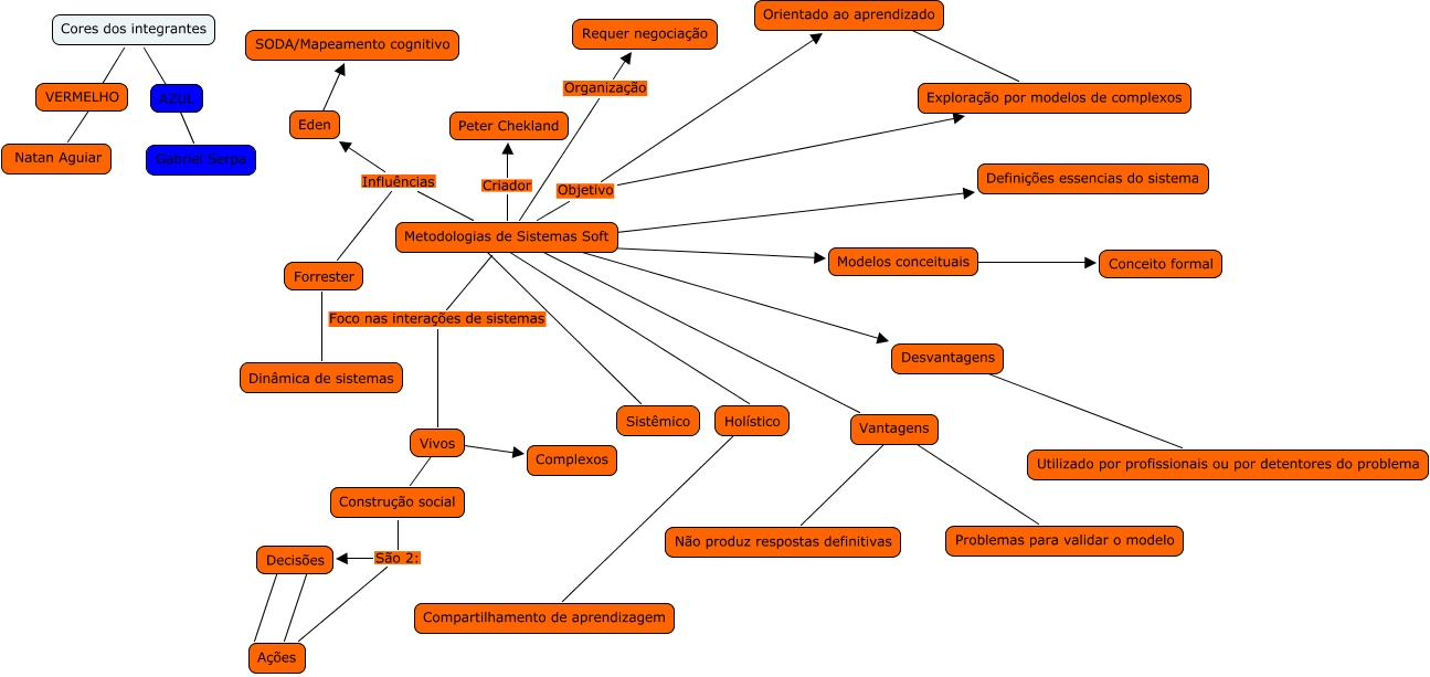 Esse mapa conceitual, produzido no IHMC CmapTools, tem a informação relacionada a: Cores dos integrantes & Metodologias de sistemas soft, Desvantagens ???? Utilizado por profissionais ou por detentores do problema, Vivos ???? Complexos, Metodologias de Sistemas Soft Foco nas interações de sistemas Vivos, Vivos ???? Construção social, Metodologias de Sistemas Soft ???? Definições essencias do sistema, Cores dos integrantes AZUL, Metodologias de Sistemas Soft Influências Forrester, Metodologias de Sistemas Soft Objetivo Exploração por modelos de complexos, Vantagens ???? Não produz respostas definitivas, Metodologias de Sistemas Soft Objetivo Orientado ao aprendizado, Decisões ???? Ações, Metodologias de Sistemas Soft ???? Vantagens, Construção social São 2: Ações, Metodologias de Sistemas Soft Influências Eden, Construção social São 2: Decisões, Holístico ???? Compartilhamento de aprendizagem, Forrester ???? Dinâmica de sistemas, Metodologias de Sistemas Soft ???? Desvantagens, Eden ???? SODA/Mapeamento cognitivo, Cores dos integrantes Gabriel Serpa