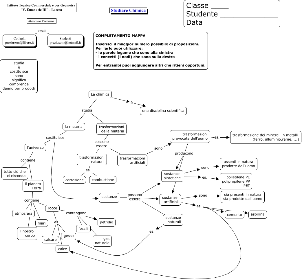 Questa Cmap, creata con IHMC CmapTools, contiene informazioni relative a: Studiare Chimica - Da montare, Marcello Preziuso email Studenti preziusom@hotmail.it, Marcello Preziuso email Colleghi preziusom@libero.it, l'universo contiene il pianeta Terra, il pianeta Terra contiene rocce, rocce es. gesso, trasformazioni artificiali sono trasformazioni provocate dell'uomo, sostanze artificiali es. cemento, sostanze artificiali es. calce, La chimica è una disciplina scientifica, La chimica studia la materia, la materia costituisce l'universo, il pianeta Terra contiene mari, rocce es. calcare, trasformazioni della materia possono essere trasformazioni artificiali, trasformazioni naturali es. corrosione, trasformazioni naturali es. combustione, trasformazioni provocate dell'uomo es. trasformazione dei minerali in metalli (ferro, alluminio,rame, ...), sostanze possono essere sostanze artificiali, sostanze possono essere sostanze sintetiche, trasformazioni provocate dell'uomo producono sostanze sintetiche