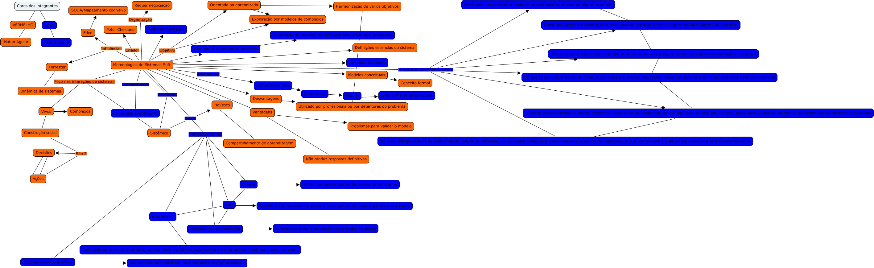 Esse mapa conceitual, produzido no IHMC CmapTools, tem a informação relacionada a: Metodologias de sistemas soft final, O quinto passo abandona o mundo sistêmico e volta ao mundo real onde há a comparação do segundo e quarto passo para elencar as mudanças que realmente se mostraram ajustadas ???? No quarto passo formam-se os modelos conceituais que serão realizações ideais que deveriam ser feitas para cada definição essencial, Decisões ???? Ações, Proprietário ???? Cada sistema tem um propritário, ou seja , tem o poder começar acima e fechar abaixo o sistema ( poder do veto ), Forrester ???? Dinâmica de sistemas, Metodologias de Sistemas Soft Definições de raiz Cliente, Eden ???? SODA/Mapeamento cognitivo, Metodologias de Sistemas Soft Raciocínio Sistêmico, Holístico ???? Compartilhamento de aprendizagem, Metodologias de Sistemas Soft Organização Requer negociação, O quinto passo abandona o mundo sistêmico e volta ao mundo real onde há a comparação do segundo e quarto passo para elencar as mudanças que realmente se mostraram ajustadas ???? No sexto estágio através do conhecimento cultural da empresa, são aplicados testes para comprovar se elas são ou não factíveis.Em sua última parte a SSM propõe as ações a serem implementadas, Ator ???? Proprietário, O segundo passo será estruturá-lo relacionando estrutura e processo para montar quadros ou situações ???? O primeiro passo está em destacar uma situação-problema ou algum incômodo, Ator ???? Transformam entradas em saidas e executam as atividades definidas no sistema, Cliente ???? Ator, Visa apoiar o tomador de decisões ???? Construção de modelos de ação para solucionar seus problemas, Metodologias de Sistemas Soft A estrutura do SSM consiste: O quinto passo abandona o mundo sistêmico e volta ao mundo real onde há a comparação do segundo e quarto passo para elencar as mudanças que realmente se mostraram ajustadas, Modelo ???? Uma forma de gerar debate, Posteriormente para melhor entendê-lo utiliza-se uma abordagem sistêmica na busca de definições essenciais ???? O segundo passo será estruturá-lo relacionando estrutura e processo para montar quadros ou situações, Metodologias de Sistemas Soft ???? Definições essencias do sistema, Metodologias de Sistemas Soft ???? Vantagens