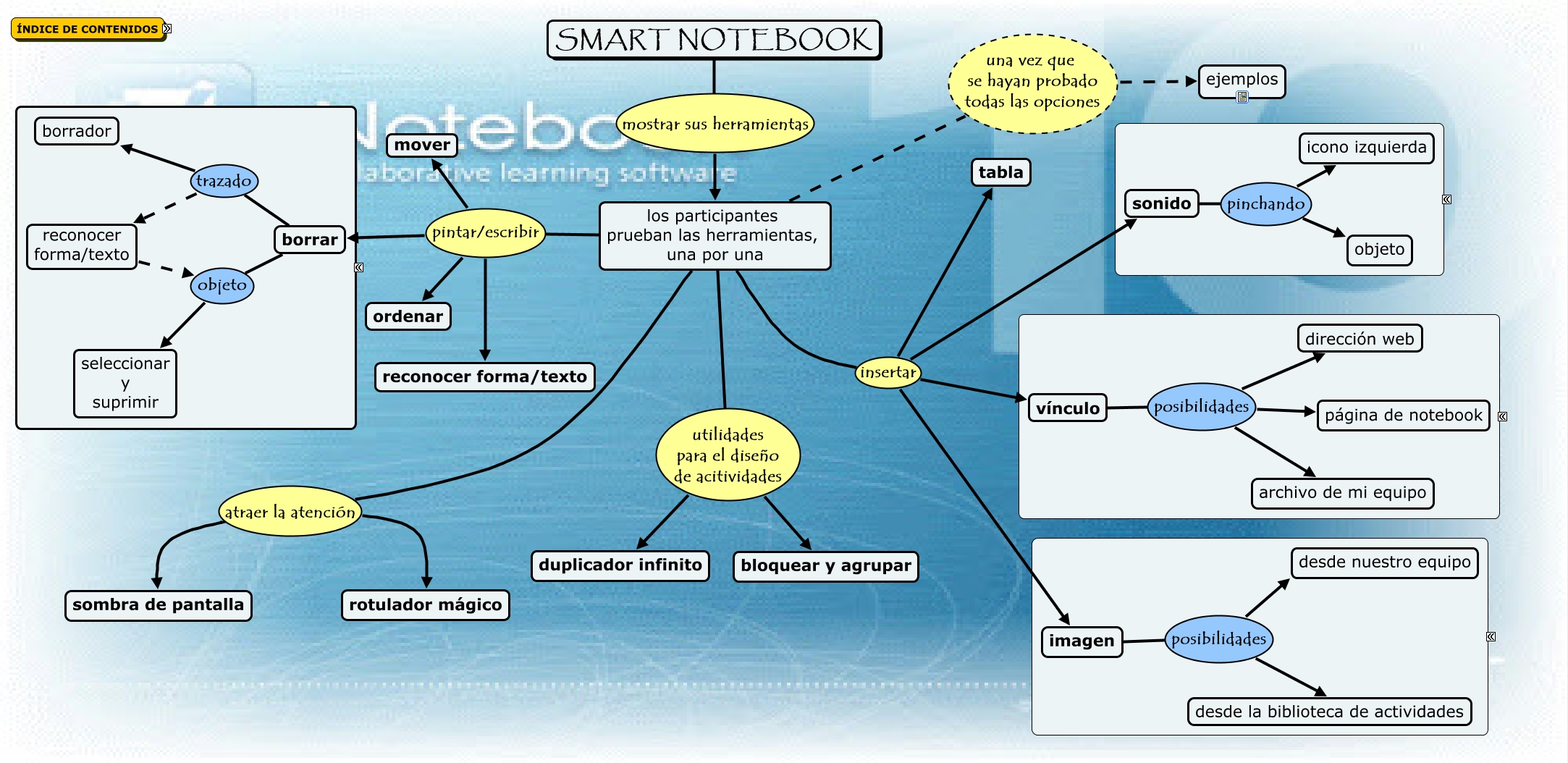 Este Cmap, tiene información relacionada con: Herramientas Básicas, los participantes prueban las herramientas, una por una insertar imagen, los participantes prueban las herramientas, una por una pintar/escribir borrar, los participantes prueban las herramientas, una por una atraer la atención rotulador mágico, los participantes prueban las herramientas, una por una pintar/escribir reconocer forma/texto, los participantes prueban las herramientas, una por una pintar/escribir ordenar, reconocer forma/texto objeto seleccionar y suprimir, imagen posibilidades desde nuestro equipo, los participantes prueban las herramientas, una por una insertar sonido, borrar objeto seleccionar y suprimir, borrar trazado borrador, vínculo posibilidades página de notebook, borrar trazado reconocer forma/texto, los participantes prueban las herramientas, una por una atraer la atención sombra de pantalla, los participantes prueban las herramientas, una por una utilidades para el diseño de acitividades bloquear y agrupar, los participantes prueban las herramientas, una por una una vez que se hayan probado todas las opciones ejemplos, los participantes prueban las herramientas, una por una insertar tabla, los participantes prueban las herramientas, una por una utilidades para el diseño de acitividades duplicador infinito, los participantes prueban las herramientas, una por una pintar/escribir mover, SMART NOTEBOOK mostrar sus herramientas los participantes prueban las herramientas, una por una, imagen posibilidades desde la biblioteca de actividades
