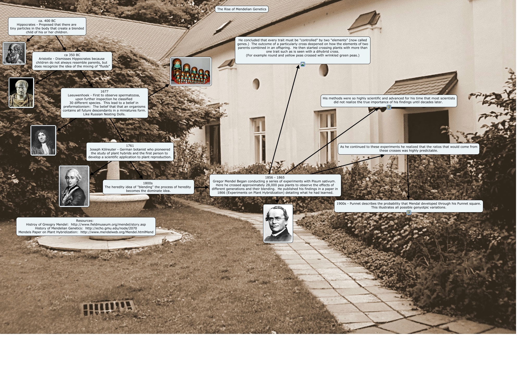 This Concept Map, created with IHMC CmapTools, has information related to: Haven_HOA1_Mendelian Genetics, 1856 - 1865 Gregor Mendel Began conducting a series of experiments with Pisum sativum. Here he crossed approximately 28,000 pea plants to observe the effects of different generations and their blending. He published his findings in a paper in 1866 (Experiments on Plant Hybridization) detailing what he had learned. ???? He concluded that every trait must be "controlled" by two "elements" (now called genes.) The outcome of a particularly cross deepened on how the elements of two parents combined in an offspring. He then started crossing plants with more than one trait such as is seen with a dihybrid cross. (For example round and yellow peas crossed with wrinkled green peas.), 1761 Joseph Kölreuter - German botanist who pioneered the study of plant hybrids and the first person to develop a scientific application to plant reproduction. ???? 1800s The heredity idea of "blending" the process of heredity becomes the dominate idea., 1761 Joseph Kölreuter - German botanist who pioneered the study of plant hybrids and the first person to develop a scientific application to plant reproduction. ????, ca 350 BC Aristotle - Dismisses Hippocrates because children do not always resemble parents, but does recognize the idea of the mixing of "fluids" ???? 1677 Leeuwenhoek - First to observe spermatozoa, upon further inspection he classified 30 different species. This lead to a belief in preformationism: The belief that that an organisms contains all future descendants in a miniatures form. Like Russian Nesting Dolls., 1856 - 1865 Gregor Mendel Began conducting a series of experiments with Pisum sativum. Here he crossed approximately 28,000 pea plants to observe the effects of different generations and their blending. He published his findings in a paper in 1866 (Experiments on Plant Hybridization) detailing what he had learned. ???? As he continued to these experiments he realized that the ratios that would come from these crosses was highly predictable., ca. 400 BC Hippocrates - Proposed that there are tiny particles in the body that create a blended child of his or her children. ????, ca 350 BC Aristotle - Dismisses Hippocrates because children do not always resemble parents, but does recognize the idea of the mixing of "fluids" ????, 1677 Leeuwenhoek - First to observe spermatozoa, upon further inspection he classified 30 different species. This lead to a belief in preformationism: The belief that that an organisms contains all future descendants in a miniatures form. Like Russian Nesting Dolls. ???? ????, 1677 Leeuwenhoek - First to observe spermatozoa, upon further inspection he classified 30 different species. This lead to a belief in preformationism: The belief that that an organisms contains all future descendants in a miniatures form. Like Russian Nesting Dolls. ????, 1677 Leeuwenhoek - First to observe spermatozoa, upon further inspection he classified 30 different species. This lead to a belief in preformationism: The belief that that an organisms contains all future descendants in a miniatures form. Like Russian Nesting Dolls. ???? 1761 Joseph Kölreuter - German botanist who pioneered the study of plant hybrids and the first person to develop a scientific application to plant reproduction., 1800s The heredity idea of "blending" the process of heredity becomes the dominate idea. ???? 1856 - 1865 Gregor Mendel Began conducting a series of experiments with Pisum sativum. Here he crossed approximately 28,000 pea plants to observe the effects of different generations and their blending. He published his findings in a paper in 1866 (Experiments on Plant Hybridization) detailing what he had learned., ca. 400 BC Hippocrates - Proposed that there are tiny particles in the body that create a blended child of his or her children. ???? ca 350 BC Aristotle - Dismisses Hippocrates because children do not always resemble parents, but does recognize the idea of the mixing of "fluids", 1856 - 1865 Gregor Mendel Began conducting a series of experiments with Pisum sativum. Here he crossed approximately 28,000 pea plants to observe the effects of different generations and their blending. He published his findings in a paper in 1866 (Experiments on Plant Hybridization) detailing what he had learned. ???? His methods were so highly scientific and advanced for his time that most scientists did not realize the true importance of his findings until decades later., As he continued to these experiments he realized that the ratios that would come from these crosses was highly predictable. ???? 1900s - Punnet describes the probability that Mendal developed through his Punnet square. This illustrates all possible genyotpic variations., 1856 - 1865 Gregor Mendel Began conducting a series of experiments with Pisum sativum. Here he crossed approximately 28,000 pea plants to observe the effects of different generations and their blending. He published his findings in a paper in 1866 (Experiments on Plant Hybridization) detailing what he had learned. ????