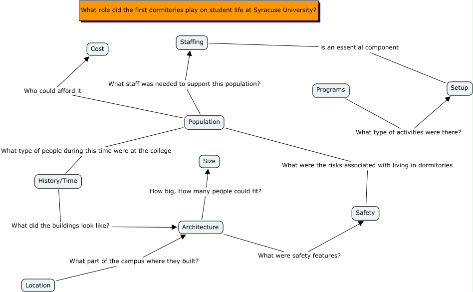 This Concept Map, created with IHMC CmapTools, has information related to: Trevor-Residence Life, History/Time What did the buildings look like? Architecture, Population What type of people during this time were at the college History/Time, Population What staff was needed to support this population? Staffing, Architecture How big, How many people could fit? Size, Architecture What were safety features? Safety, Population What were the risks associated with living in dormitories Safety, Programs What type of activities were there? Setup, Population Who could afford it Cost, Staffing is an essential component Setup, Location What part of the campus where they built? Architecture