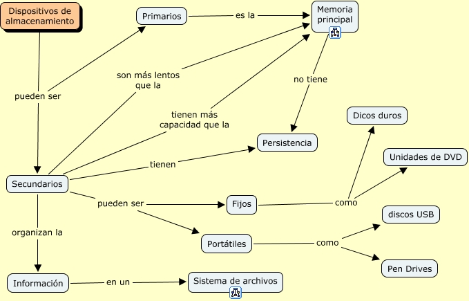 Este Cmap, tiene información relacionada con: Dispositivos de almacenamiento, Memoria principal no tiene Persistencia, Portátiles como discos USB, Fijos como Unidades de DVD, Dispositivos de almacenamiento pueden ser Secundarios, Secundarios tienen más capacidad que la Memoria principal, Primarios es la Memoria principal, Fijos como Dicos duros, Secundarios organizan la Información, Secundarios son más lentos que la Memoria principal, Secundarios pueden ser Portátiles, Información en un Sistema de archivos, Dispositivos de almacenamiento pueden ser Primarios, Portátiles como Pen Drives, Secundarios pueden ser Fijos, Secundarios tienen Persistencia