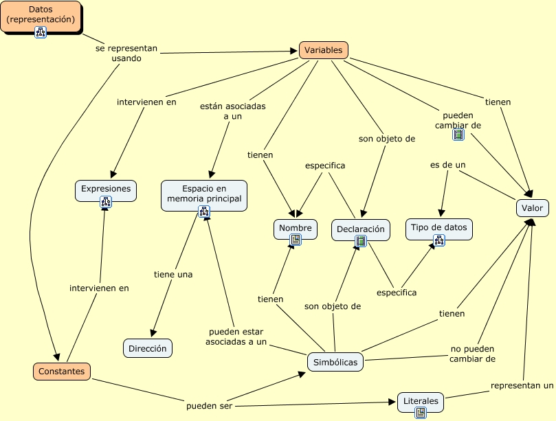 Este Cmap, tiene información relacionada con: Datos-representación, Literales representan un Valor, Datos (representación) se representan usando Variables, Variables intervienen en Expresiones, Valor es de un Tipo de datos, Simbólicas son objeto de Declaración, Constantes pueden ser Literales, Datos (representación) se representan usando Constantes, Variables pueden cambiar de Valor, Simbólicas pueden estar asociadas a un Espacio en memoria principal, Variables tienen Nombre, Simbólicas tienen Nombre, Espacio en memoria principal tiene una Dirección, Variables tienen Valor, Constantes pueden ser Simbólicas, Simbólicas no pueden cambiar de Valor, Variables están asociadas a un Espacio en memoria principal, Declaración especifica Tipo de datos, Constantes intervienen en Expresiones, Variables son objeto de Declaración, Simbólicas tienen Valor
