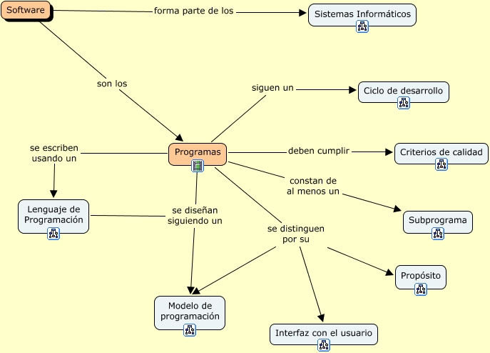 Este Cmap, tiene información relacionada con: Software, Programas constan de al menos un Subprograma, Programas deben cumplir Criterios de calidad, Programas se distinguen por su Propósito, Programas se escriben usando un Lenguaje de Programación, Software forma parte de los Sistemas Informáticos, Lenguaje de Programación se diseñan siguiendo un Modelo de programación, Programas siguen un Ciclo de desarrollo, Programas se diseñan siguiendo un Modelo de programación, Programas se distinguen por su Interfaz con el usuario, Software son los Programas, Programas se distinguen por su Modelo de programación