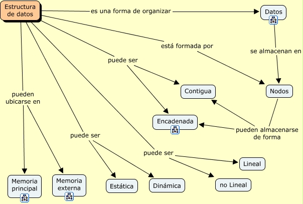 Este Cmap, tiene información relacionada con: Estructura de datos, Estructura de datos pueden ubicarse en Memoria externa, Estructura de datos puede ser Encadenada, Estructura de datos puede ser Dinámica, Estructura de datos puede ser Contigua, Estructura de datos puede ser Lineal, Nodos pueden almacenarse de forma Contigua, Datos se almacenan en Nodos, Nodos pueden almacenarse de forma Encadenada, Estructura de datos pueden ubicarse en Memoria principal, Estructura de datos está formada por Nodos, Estructura de datos es una forma de organizar Datos, Estructura de datos puede ser Estática, Estructura de datos puede ser no Lineal