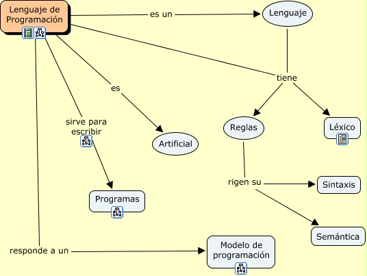 Este Cmap, tiene información relacionada con: Lenguajes, Lenguaje de Programación tiene Reglas, Lenguaje de Programación es un Lenguaje, Reglas rigen su Semántica, Lenguaje de Programación es Artificial, Lenguaje de Programación responde a un Modelo de programación, Lenguaje de Programación sirve para escribir Programas, Reglas rigen su Sintaxis, Lenguaje tiene Léxico, Lenguaje de Programación tiene Léxico, Lenguaje tiene Reglas
