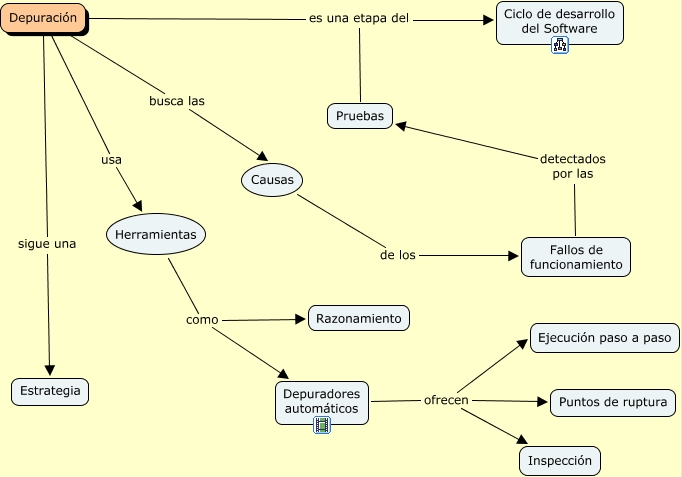 Este Cmap, tiene información relacionada con: Depuración, Depuración busca las Causas, Depuración es una etapa del Ciclo de desarrollo del Software, Herramientas como Depuradores automáticos, Fallos de funcionamiento detectados por las Pruebas, Causas de los Fallos de funcionamiento, Pruebas es una etapa del Ciclo de desarrollo del Software, Depuradores automáticos ofrecen Inspección, Herramientas como Razonamiento, Depuradores automáticos ofrecen Puntos de ruptura, Depuración sigue una Estrategia, Depuradores automáticos ofrecen Ejecución paso a paso, Depuración usa Herramientas