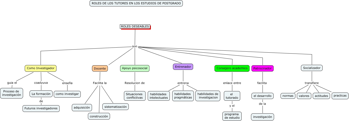 Este Cmap, tiene información relacionada con: 4a, ROLES DESEABLES son Patrocinador, Apoyo psicosocial Resolucion de Situaciones conflictivas, La formación de Futuros investigadores, Entrenador entrena habilidades intelectuales, Como Investigador guia el Proceso de investigación, Patrocinador facilita el desarrollo, el desarrollo de la investigación, Como Investigador enseña como investigar, Como Investigador coadyuva La formación, Socializador transfiere actitudes, ROLES DESEABLES son Consejero academico, ROLES DESEABLES son Apoyo psicosocial, el tutorado y el programa de estudio, ROLES DESEABLES son Entrenador, Docente Facilita la adquisición, ROLES DESEABLES son Como Investigador, ROLES DESEABLES son Socializador, Socializador transfiere normas, Entrenador entrena habilidades pragmáticas, Consejero academico enlace entre el tutorado