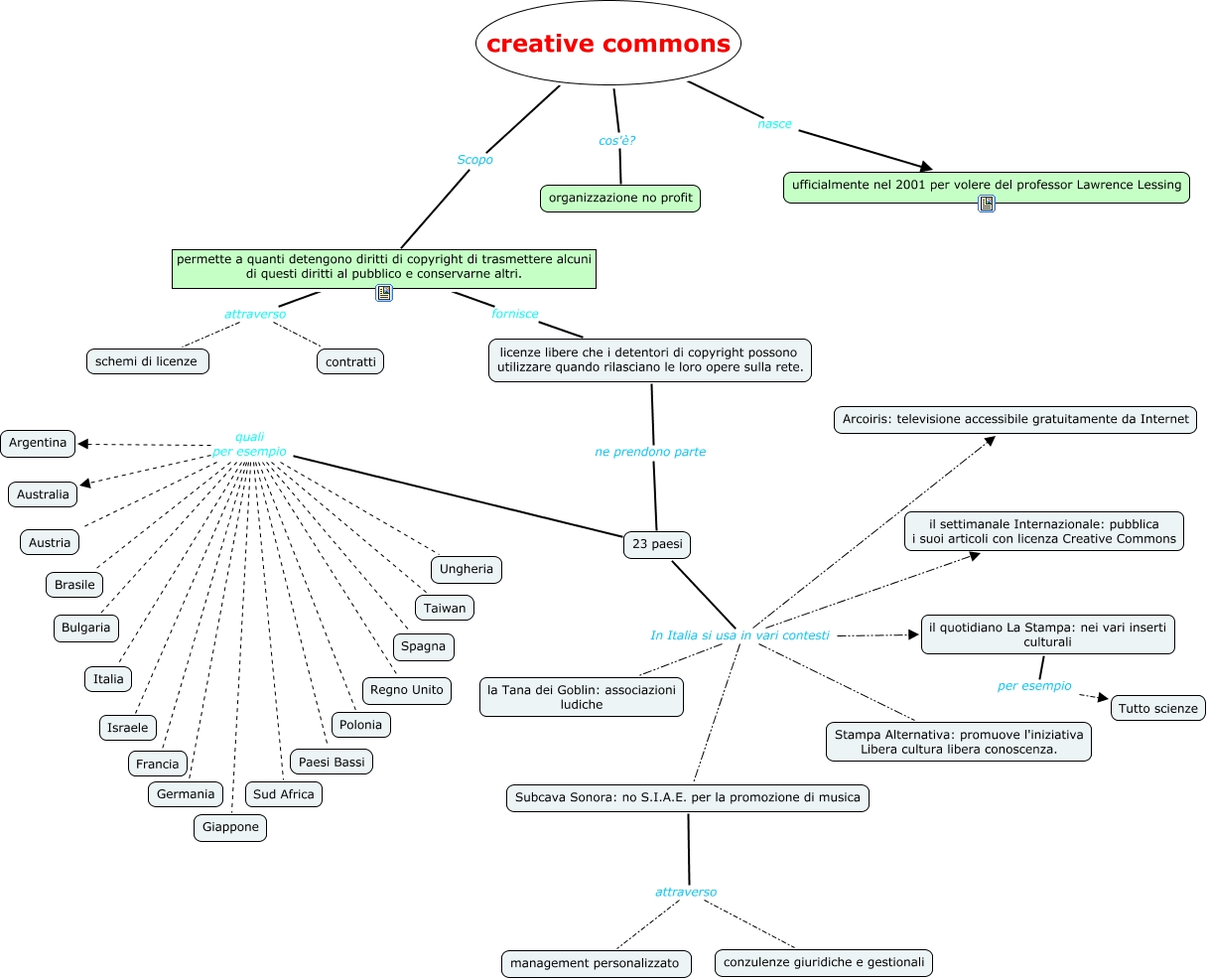 Questa Cmap, creata con IHMC CmapTools, contiene informazioni relative a: creative commons, 23 paesi quali per esempio Polonia, 23 paesi quali per esempio Brasile, 23 paesi quali per esempio Ungheria, 23 paesi quali per esempio Taiwan, 23 paesi In Italia si usa in vari contesti il quotidiano La Stampa: nei vari inserti culturali, 23 paesi In Italia si usa in vari contesti il settimanale Internazionale: pubblica i suoi articoli con licenza Creative Commons, 23 paesi quali per esempio Germania, il quotidiano La Stampa: nei vari inserti culturali per esempio Tutto scienze, licenze libere che i detentori di copyright possono utilizzare quando rilasciano le loro opere sulla rete. ne prendono parte 23 paesi, creative commons nasce ufficialmente nel 2001 per volere del professor Lawrence Lessing, 23 paesi quali per esempio Bulgaria, 23 paesi quali per esempio Paesi Bassi, 23 paesi quali per esempio Israele, Subcava Sonora: no S.I.A.E. per la promozione di musica attraverso conzulenze giuridiche e gestionali, 23 paesi In Italia si usa in vari contesti Arcoiris: televisione accessibile gratuitamente da Internet, 23 paesi quali per esempio Australia, permette a quanti detengono diritti di copyright di trasmettere alcuni di questi diritti al pubblico e conservarne altri. attraverso contratti, 23 paesi In Italia si usa in vari contesti la Tana dei Goblin: associazioni ludiche, permette a quanti detengono diritti di copyright di trasmettere alcuni di questi diritti al pubblico e conservarne altri. attraverso schemi di licenze, Subcava Sonora: no S.I.A.E. per la promozione di musica attraverso management personalizzato