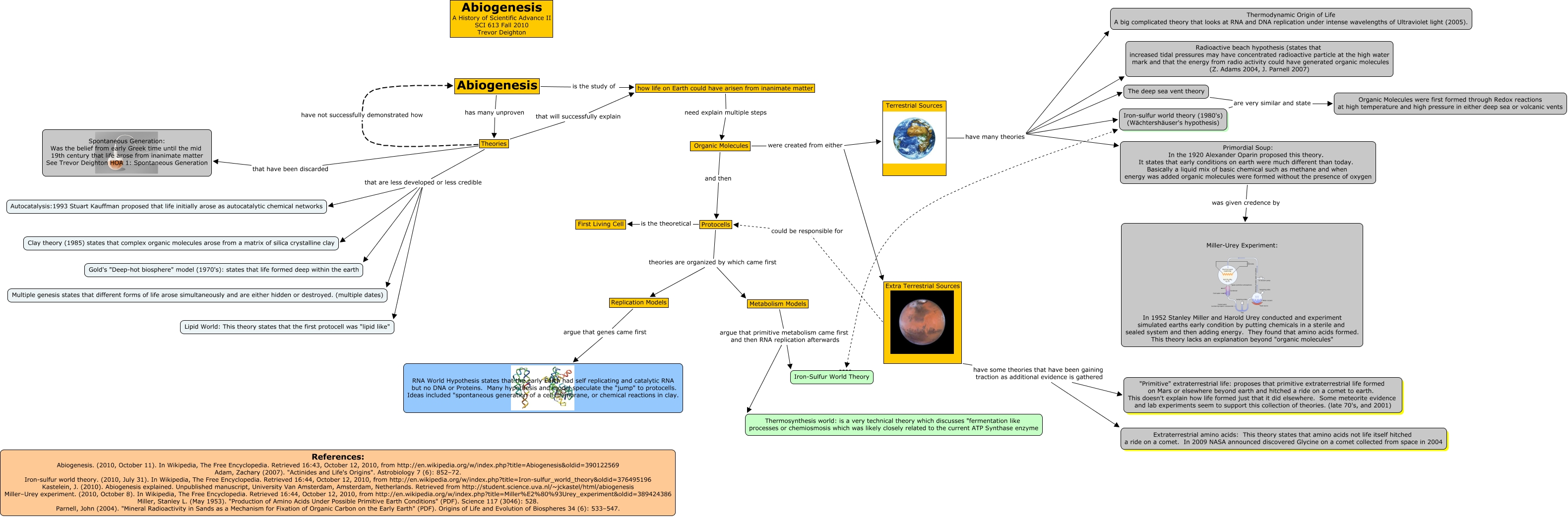Este Cmap, tiene información relacionada con: Deighton HOA 2 Abiogenesis, Primordial Soup: In the 1920 Alexander Oparin proposed this theory. It states that early conditions on earth were much different than today. Basically a liquid mix of basic chemical such as methane and when energy was added organic molecules were formed without the presence of oxygen was given credence by Miller-Urey Experiment: In 1952 Stanley Miller and Harold Urey conducted and experiment simulated earths early condition by putting chemicals in a sterile and sealed system and then adding energy. They found that amino acids formed. This theory lacks an explanation beyond "organic molecules", Protocells is the theoretical First Living Cell, how life on Earth could have arisen from inanimate matter need explain multiple steps Organic Molecules, Iron-sulfur world theory (1980's) (Wächtershäuser's hypothesis) are very similar and state Organic Molecules were first formed through Redox reactions at high temperature and high pressure in either deep sea or volcanic vents, Theories that will successfully explain how life on Earth could have arisen from inanimate matter, Organic Molecules were created from either Terrestrial Sources, Extra Terrestrial Sources have some theories that have been gaining traction as additional evidence is gathered "Primitive" extraterrestrial life: proposes that primitive extraterrestrial life formed on Mars or elsewhere beyond earth and hitched a ride on a comet to earth. This doesn't explain how life formed just that it did elsewhere. Some meteorite evidence and lab experiments seem to support this collection of theories. (late 70's, and 2001), Replication Models argue that genes came first RNA World Hypothesis states that the early Earth had self replicating and catalytic RNA but no DNA or Proteins. Many hypothesis and model speculate the "jump" to protocells. Ideas included "spontaneous generation of a cell membrane, or chemical reactions in clay., Terrestrial Sources have many theories Thermodynamic Origin of Life A big complicated theory that looks at RNA and DNA replication under intense wavelengths of Ultraviolet light (2005)., Theories that have been discarded Spontaneous Generation: Was the belief from early Greek time until the mid 19th century that life arose from inanimate matter See Trevor Deighton HOA 1: Spontaneous Generation, Terrestrial Sources have many theories Iron-sulfur world theory (1980's) (Wächtershäuser's hypothesis), Theories that are less developed or less credible Autocatalysis:1993 Stuart Kauffman proposed that life initially arose as autocatalytic chemical networks, Extra Terrestrial Sources could be responsible for Protocells, Terrestrial Sources have many theories Radioactive beach hypothesis (states that increased tidal pressures may have concentrated radioactive particle at the high water mark and that the energy from radio activity could have generated organic molecules (Z. Adams 2004, J. Parnell 2007), Theories that are less developed or less credible Gold's "Deep-hot biosphere" model (1970's): states that life formed deep within the earth, Theories have not successfully demonstrated how Abiogenesis, Protocells theories are organized by which came first Replication Models, The deep sea vent theory are very similar and state Organic Molecules were first formed through Redox reactions at high temperature and high pressure in either deep sea or volcanic vents, Theories that are less developed or less credible Multiple genesis states that different forms of life arose simultaneously and are either hidden or destroyed. (multiple dates), Metabolism Models argue that primitive metabolism came first and then RNA replication afterwards Iron-Sulfur World Theory