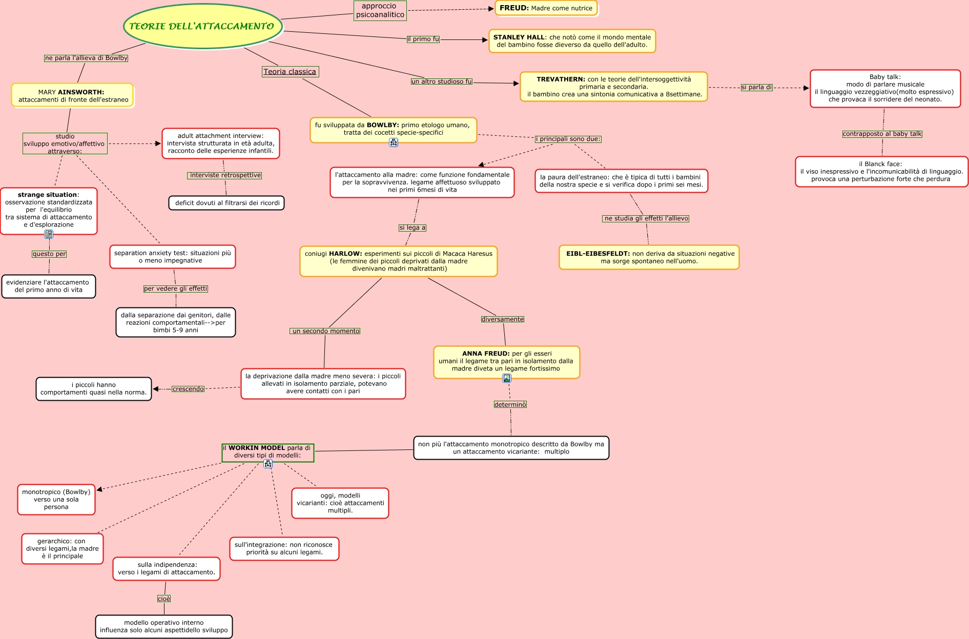 Questa Cmap, creata con IHMC CmapTools, contiene informazioni relative a: TEORIE DELL'ATTACCAMENTO, TEORIE DELL'ATTACCAMENTO Teoria classica fu sviluppata da BOWLBY: primo etologo umano, tratta dei cocetti specie-specifici, coniugi HARLOW: esperimenti sui piccoli di Macaca Haresus (le femmine dei piccoli deprivati dalla madre divenivano madri maltrattanti) diversamente ANNA FREUD: per gli esseri umani il legame tra pari in isolamento dalla madre diveta un legame fortissimo, ANNA FREUD: per gli esseri umani il legame tra pari in isolamento dalla madre diveta un legame fortissimo determinò non più l'attaccamento monotropico descritto da Bowlby ma un attaccamento vicariante: multiplo, TEORIE DELL'ATTACCAMENTO ne parla l'allieva di Bowlby MARY AINSWORTH: attaccamenti di fronte dell'estraneo, Baby talk: modo di parlare musicale il linguaggio vezzeggiativo(molto espressivo) che provaca il sorridere del neonato. contrapposto al baby talk il Blanck face: il viso inespressivo e l'incomunicabilità di linguaggio. provoca una perturbazione forte che perdura, l'attaccamento alla madre: come funzione fondamentale per la sopravvivenza. legame affettuoso sviluppato nei primi 6mesi di vita si lega a coniugi HARLOW: esperimenti sui piccoli di Macaca Haresus (le femmine dei piccoli deprivati dalla madre divenivano madri maltrattanti), sulla indipendenza: verso i legami di attaccamento. cioè modello operativo interno influenza solo alcuni aspettidello sviluppo, strange situation: osservazione standardizzata per l'equilibrio tra sistema di attaccamento e d'esplorazione questo per evidenziare l'attaccamento del primo anno di vita, adult attachment interview: intervista strutturata in età adulta, racconto delle esperienze infantili. interviste retrospettive deficit dovuti al filtrarsi dei ricordi, TREVATHERN: con le teorie dell'intersoggettività primaria e secondaria. il bambino crea una sintonia comunicativa a 8settimane. si parla di Baby talk: modo di parlare musicale il linguaggio vezzeggiativo(molto espressivo) che provaca il sorridere del neonato., TEORIE DELL'ATTACCAMENTO approccio psicoanalitico FREUD: Madre come nutrice, la deprivazione dalla madre meno severa: i piccoli allevati in isolamento parziale, potevano avere contatti con i pari crescendo i piccoli hanno comportamenti quasi nella norma., MARY AINSWORTH: attaccamenti di fronte dell'estraneo studio sviluppo emotivo/affettivo attraverso: adult attachment interview: intervista strutturata in età adulta, racconto delle esperienze infantili., TEORIE DELL'ATTACCAMENTO un altro studioso fu TREVATHERN: con le teorie dell'intersoggettività primaria e secondaria. il bambino crea una sintonia comunicativa a 8settimane., non più l'attaccamento monotropico descritto da Bowlby ma un attaccamento vicariante: multiplo il WORKIN MODEL parla di diversi tipi di modelli: oggi, modelli vicarianti: cioè attaccamenti multipli., non più l'attaccamento monotropico descritto da Bowlby ma un attaccamento vicariante: multiplo il WORKIN MODEL parla di diversi tipi di modelli: gerarchico: con diversi legami,la madre è il principale, MARY AINSWORTH: attaccamenti di fronte dell'estraneo studio sviluppo emotivo/affettivo attraverso: strange situation: osservazione standardizzata per l'equilibrio tra sistema di attaccamento e d'esplorazione, non più l'attaccamento monotropico descritto da Bowlby ma un attaccamento vicariante: multiplo il WORKIN MODEL parla di diversi tipi di modelli: sulla indipendenza: verso i legami di attaccamento., fu sviluppata da BOWLBY: primo etologo umano, tratta dei cocetti specie-specifici i principali sono due: la paura dell'estraneo: che è tipica di tutti i bambini della nostra specie e si verifica dopo i primi sei mesi., separation anxiety test: situazioni più o meno impegnative per vedere gli effetti dalla separazione dai genitori, dalle reazioni comportamentali-->per bimbi 5-9 anni