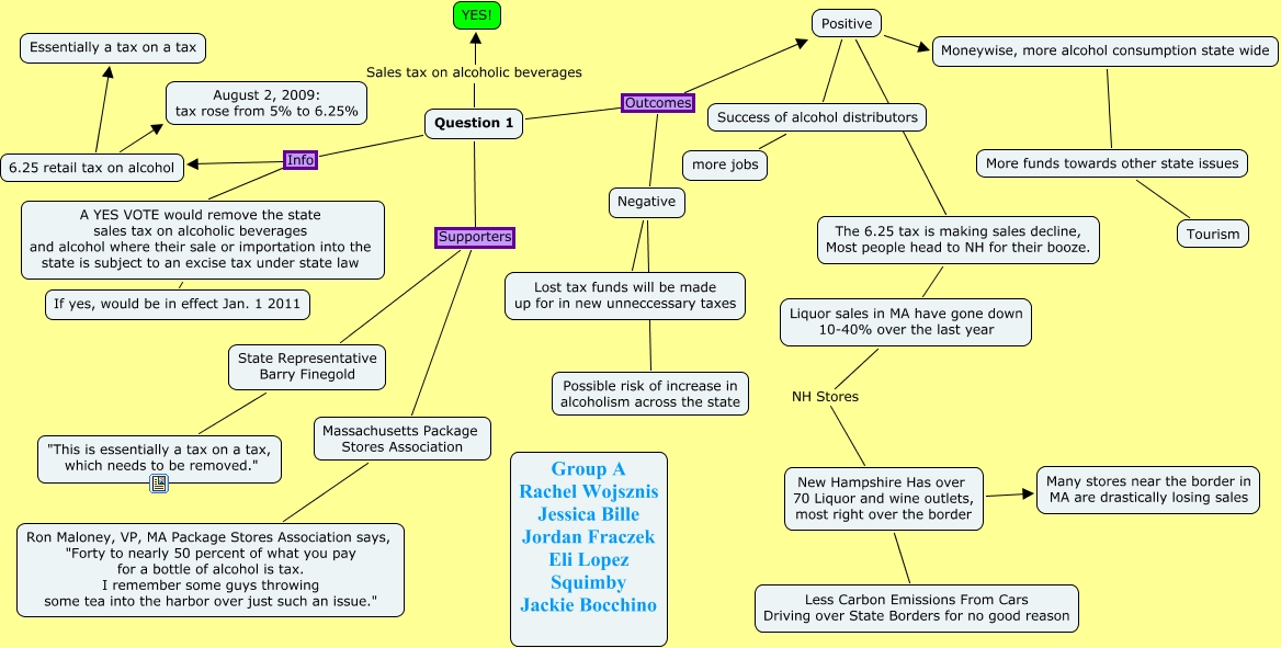 This Concept Map, created with IHMC CmapTools, has information related to: Group A Question 1, Question 1 Outcomes Positive, Question 1 Info A YES VOTE would remove the state sales tax on alcoholic beverages and alcohol where their sale or importation into the state is subject to an excise tax under state law, 6.25 retail tax on alcohol Essentially a tax on a tax, Negative Lost tax funds will be made up for in new unneccessary taxes, Moneywise, more alcohol consumption state wide More funds towards other state issues, State Representative Barry Finegold "This is essentially a tax on a tax, which needs to be removed.", 6.25 retail tax on alcohol August 2, 2009: tax rose from 5% to 6.25%, Positive Moneywise, more alcohol consumption state wide, Question 1 Info 6.25 retail tax on alcohol, Massachusetts Package Stores Association Ron Maloney, VP, MA Package Stores Association says, "Forty to nearly 50 percent of what you pay for a bottle of alcohol is tax. I remember some guys throwing some tea into the harbor over just such an issue.", Positive Success of alcohol distributors, A YES VOTE would remove the state sales tax on alcoholic beverages and alcohol where their sale or importation into the state is subject to an excise tax under state law If yes, would be in effect Jan. 1 2011, New Hampshire Has over 70 Liquor and wine outlets, most right over the border Many stores near the border in MA are drastically losing sales, Success of alcohol distributors more jobs, The 6.25 tax is making sales decline, Most people head to NH for their booze. Liquor sales in MA have gone down 10-40% over the last year, Question 1 Outcomes Negative, Question 1 Sales tax on alcoholic beverages YES!, Question 1 Supporters State Representative Barry Finegold, Negative Possible risk of increase in alcoholism across the state, Liquor sales in MA have gone down 10-40% over the last year NH Stores New Hampshire Has over 70 Liquor and wine outlets, most right over the border