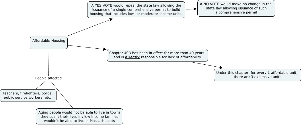 This Concept Map, created with IHMC CmapTools, has information related to: Group b Question 2, Affordable Housing A YES VOTE would repeal the state law allowing the issuance of a single comprehensive permit to build housing that includes low- or moderate-income units., Affordable Housing People affected Aging people would not be able to live in towns they spent their lives in; low income families wouldn't be able to live in Massachusetts, A YES VOTE would repeal the state law allowing the issuance of a single comprehensive permit to build housing that includes low- or moderate-income units. A NO VOTE would make no change in the state law allowing issuance of such a comprehensive permit., Affordable Housing People affected Teachers, firefighters, police, public service workers, etc., Affordable Housing Chapter 40B has been in effect for more than 40 years and is directly responsible for lack of affordability, Chapter 40B has been in effect for more than 40 years and is directly responsible for lack of affordability Under this chapter, for every 1 affordable unit, there are 3 expensive units
