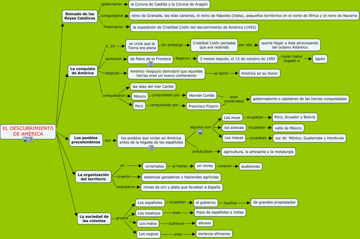Este Cmap, tiene información relacionada con: El descubrimiento de América, se creía que la Tierra era plana sin embargo Cristóbal Colón pensaba que era redonda, La sociedad de las colonias grupos Los indios, La organización del territorio crearon estancias ganaderas y haciendas agrícolas, los pueblos que vivían en América antes de la llegada de los españoles algunos son Los incas, los aztecas ocupaban valle de México, los pueblos que vivían en América antes de la llegada de los españoles algunos son los aztecas, EL DESCUBRIMIENTO DE AMÉRICA La sociedad de las colonias, EL DESCUBRIMIENTO DE AMÉRICA La conquista de América, Hernán Cortés eran nombrados gobernadores o capitanes de las tierras conquistadas, Cristóbal Colón pensaba que era redonda por ello quería llegar a Asia atravesando del océano Atlántico, EL DESCUBRIMIENTO DE AMÉRICA Reinado de los Reyes Católicos, La sociedad de las colonias grupos Los españoles, 2 meses depués, el 12 de octubre de 1492 creían haber llegado a Japón, los pueblos que vivían en América antes de la llegada de los españoles prácticaban agricultura, la artesanía y la metalurgía, los pueblos que vivían en América antes de la llegada de los españoles algunos son Los mayas, La sociedad de las colonias grupos Los mestizos, Los mestizos eran hijos de españoles e indias, La conquista de América S. XV se creía que la Tierra era plana, La organización del territorio en virreinatos, La sociedad de las colonias grupos Los negros