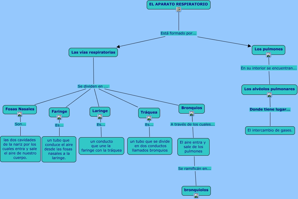 Este Cmap, tiene información relacionada con: El aparato respiratorio, Fosas Nasales Son... las dos cavidades de la nariz por los cuales entra y sale el aire de nuestro cuerpo., Las vías respiratorias Se dividen en ... Bronquios, Las vías respiratorias Se dividen en ... Tráquea, Faringe Es... un tubo que conduce el aire desde las fosas nasales a la laringe., Los alvéolos pulmonares Donde tiene lugar... El intercambio de gases., EL APARATO RESPIRATORIO Está formado por... Los pulmones, Las vías respiratorias Se dividen en ... Fosas Nasales, EL APARATO RESPIRATORIO Está formado por... Las vías respiratorias, Las vías respiratorias Se dividen en ... Faringe, Las vías respiratorias Se dividen en ... Laringe, Los pulmones En su interior se encuentran... Los alvéolos pulmonares, El aire entra y sale de los pulmones Se ramificán en... bronquiolos, Tráquea Es... un tubo que se divide en dos conductos llamados bronquios, Laringe Es... un conducto que une la faringe con la tráquea, Bronquios A través de los cuales... El aire entra y sale de los pulmones