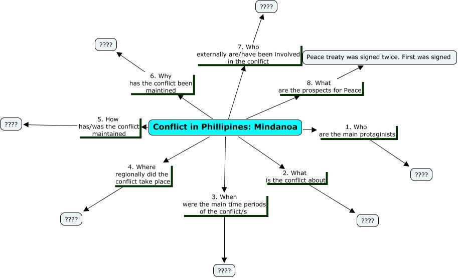 This Concept Map, created with IHMC CmapTools, has information related to: Conflict_Scenario_Map, Conflict in Phillipines: Mindanoa 6. Why has the conflict been maintined ????, Conflict in Phillipines: Mindanoa 2. What is the conflict about ????, Conflict in Phillipines: Mindanoa 3. When were the main time periods of the conflict/s ????, Conflict in Phillipines: Mindanoa 1. Who are the main protaginists ????, Conflict in Phillipines: Mindanoa 7. Who externally are/have been involved in the conlfict ????, Conflict in Phillipines: Mindanoa 8. What are the prospects for Peace Peace treaty was signed twice. First was signed, Conflict in Phillipines: Mindanoa 4. Where regionally did the conflict take place ????, Conflict in Phillipines: Mindanoa 5. How has/was the conflict maintained ????