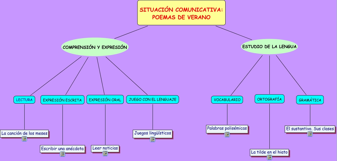 Este Cmap, tiene información relacionada con: Tema 4. Poemas de verano, SITUACIÓN COMUNICATIVA: POEMAS DE VERANO COMPRENSIÓN Y EXPRESIÓN JUEGO CON EL LENGUAJE, SITUACIÓN COMUNICATIVA: POEMAS DE VERANO ESTUDIO DE LA LENGUA VOCABULARIO, ORTOGRAFÍA La tilde en el hiato, EXPRESIÓN ORAL Leer noticias, LECTURA La canción de los meses, SITUACIÓN COMUNICATIVA: POEMAS DE VERANO COMPRENSIÓN Y EXPRESIÓN EXPRESIÓN ORAL, SITUACIÓN COMUNICATIVA: POEMAS DE VERANO COMPRENSIÓN Y EXPRESIÓN LECTURA, SITUACIÓN COMUNICATIVA: POEMAS DE VERANO ESTUDIO DE LA LENGUA GRAMÁTICA, SITUACIÓN COMUNICATIVA: POEMAS DE VERANO COMPRENSIÓN Y EXPRESIÓN EXPRESIÓN ESCRITA, SITUACIÓN COMUNICATIVA: POEMAS DE VERANO ESTUDIO DE LA LENGUA ORTOGRAFÍA, VOCABULARIO Palabras polisémicas, JUEGO CON EL LENGUAJE Juegos lingüísticos, GRAMÁTICA El sustantivo. Sus clases, EXPRESIÓN ESCRITA Escribir una anécdota