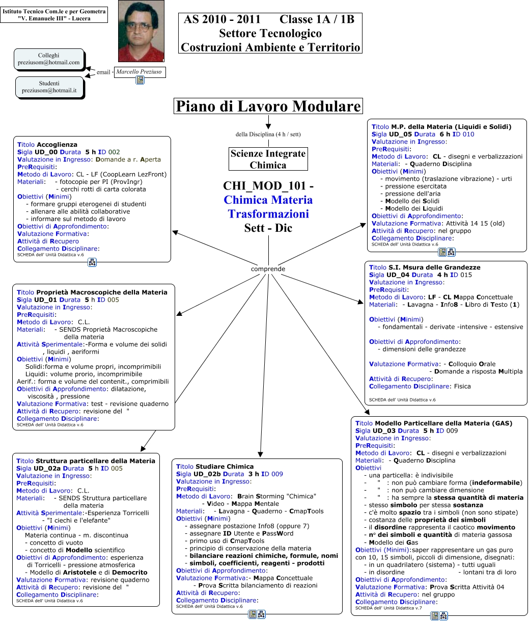 Questa Cmap, creata con IHMC CmapTools, contiene informazioni relative a: CHI_MOD_101 Chimica Materia Trasformazioni, CHI_MOD_101 - Chimica Materia Trasformazioni Sett - Dic comprende Titolo Studiare Chimica Sigla UD_02b Durata 3 h ID 009 Valutazione in Ingresso: PreRequisiti: Metodo di Lavoro: Brain Storming "Chimica" - Video - Mappa Mentale Materiali: - Lavagna - Quaderno - CmapTools Obiettivi (Minimi) - assegnare postazione Info8 (oppure 7) - assegnare ID Utente e PassWord - primo uso di CmapTools - principio di conservazione della materia - bilanciare reazioni chimiche, formule, nomi - simboli, coefficienti, reagenti - prodotti Obiettivi di Approfondimento: Valutazione Formativa:- Mappa Concettuale - Prova Scritta bilanciamento di reazioni Attività di Recupero: Collegamento Disciplinare: SCHEDA dell' Unità Didattica v.6, Piano di Lavoro Modulare della Disciplina (4 h / sett) Scienze Integrate Chimica, CHI_MOD_101 - Chimica Materia Trasformazioni Sett - Dic comprende Titolo Modello Particellare della Materia (GAS) Sigla UD_03 Durata 5 h ID 009 Valutazione in Ingresso: PreRequisiti: Metodo di Lavoro: CL - disegni e verbalizzazioni Materiali: - Quaderno Disciplina Obiettivi - una particella: è indivisibile - " : non può cambiare forma (indeformabile) - " : non può cambiare dimensione - " : ha sempre la stessa quantità di materia - stesso simbolo per stessa sostanza - c'è molto spazio tra i simboli (non sono stipate) - costanza delle proprietà dei simboli - il disordine rappresenta il caotico movimento - n° dei simboli e quantità di materia gassosa - Modello dei Gas Obiettivi (Minimi):saper rappresentare un gas puro con 10, 15 simboli, piccoli di dimensione, disegnati: - in un quadrilatero (sistema) - tutti uguali - in disordine - lontani tra di loro Obiettivi di Approfondimento: Valutazione Formativa: Prova Scritta Attività 04 Attività di Recupero: nel gruppo Collegamento Disciplinare: SCHEDA dell' Unità Didattica v.7, Marcello Preziuso email Studenti preziusom@hotmail.it, CHI_MOD_101 - Chimica Materia Trasformazioni Sett - Dic comprende Titolo Accoglienza Sigla UD_00 Durata 5 h ID 002 Valutazione in Ingresso: Domande a r. Aperta PreRequisiti: Metodo di Lavoro: CL - LF (CoopLearn LezFront) Materiali: - fotocopie per PI (ProvIngr) - cerchi rotti di carta colorata Obiettivi (Minimi) - formare gruppi eterogenei di studenti - allenare alle abilità collaborative - informare sul metodo di lavoro Obiettivi di Approfondimento: Valutazione Formativa: Attività di Recupero: Collegamento Disciplinare: SCHEDA dell' Unità Didattica v.6, CHI_MOD_101 - Chimica Materia Trasformazioni Sett - Dic comprende Titolo M.P. della Materia (Liquidi e Solidi) Sigla UD_05 Durata 6 h ID 010 Valutazione in Ingresso: PreRequisiti: Metodo di Lavoro: CL - disegni e verbalizzazioni Materiali: - Quaderno Disciplina Obiettivi (Minimi) - movimento (traslazione vibrazione) - urti - pressione esercitata - pressione dell'aria - Modello dei Solidi - Modello dei Liquidi Obiettivi di Approfondimento: Valutazione Formativa: Attività 14 15 (old) Attività di Recupero: nel gruppo Collegamento Disciplinare: SCHEDA dell' Unità Didattica v.6, CHI_MOD_101 - Chimica Materia Trasformazioni Sett - Dic comprende Titolo Proprietà Macroscopiche della Materia Sigla UD_01 Durata 5 h ID 005 Valutazione in Ingresso: PreRequisiti: Metodo di Lavoro: C.L. Materiali: - SENDS Proprietà Macroscopiche della materia Attività Sperimentale:-Forma e volume dei solidi , liquidi , aeriformi Obiettivi (Minimi) Solidi:forma e volume propri, incomprimibili Liquidi: volume prorio, incomprimibile Aerif.: forma e volume del contenit., comprimibili Obiettivi di Approfondimento: dilatazione, viscosità , pressione Valutazione Formativa: test - revisione quaderno Attività di Recupero: revisione del " Collegamento Disciplinare: SCHEDA dell' Unità Didattica v.6, CHI_MOD_101 - Chimica Materia Trasformazioni Sett - Dic comprende Titolo S.I. Msura delle Grandezze Sigla UD_04 Durata 4 h ID 015 Valutazione in Ingresso: PreRequisiti: Metodo di Lavoro: LF - CL Mappa Concettuale Materiali: - Lavagna - Info8 - Libro di Testo (1) Obiettivi (Minimi) - fondamentali - derivate -intensive - estensive Obiettivi di Approfondimento: - dimensioni delle grandezze Valutazione Formativa: - Colloquio Orale - Domande a risposta Multipla Attività di Recupero: Collegamento Disciplinare: Fisica SCHEDA dell' Unità Didattica v.6, Marcello Preziuso email Colleghi preziusom@hotmail.com, CHI_MOD_101 - Chimica Materia Trasformazioni Sett - Dic comprende Titolo Struttura particellare della Materia Sigla UD_02a Durata 5 h ID 005 Valutazione in Ingresso: PreRequisiti: Metodo di Lavoro: C.L. Materiali: - SENDS Struttura particellare della materia Attività Sperimentale:-Esperienza Torricelli - "I ciechi e l'elefante" Obiettivi (Minimi) Materia continua - m. discontinua - concetto di vuoto - concetto di Modello scientifico Obiettivi di Approfondimento: esperienza di Torricelli - pressione atmosferica - Modello di Aristotele e di Democrito Valutazione Formativa: revisione quaderno Attività di Recupero: revisione del " Collegamento Disciplinare: SCHEDA dell' Unità Didattica v.6