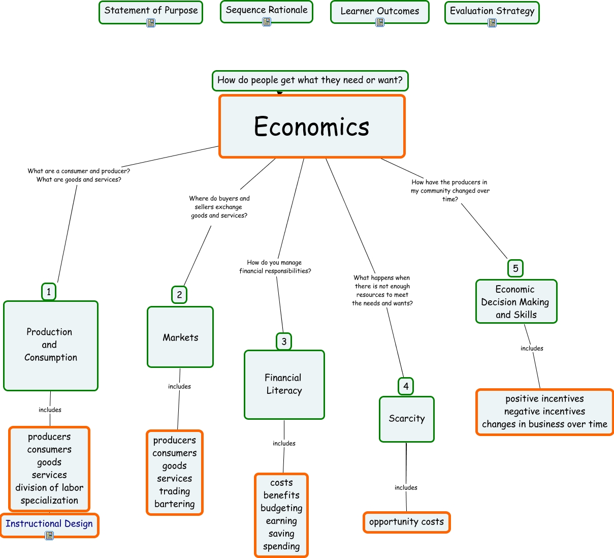 This Concept Map, created with IHMC CmapTools, has information related to: ctalowsky.cmap, Economics Where do buyers and sellers exchange goods and services? 2, Production and Consumption includes producers consumers goods services division of labor specialization, Financial Literacy includes costs benefits budgeting earning saving spending, Scarcity ???? 4, Economics How do you manage financial responsibilities? 3, Economics What happens when there is not enough resources to meet the needs and wants? 4, Economic Decision Making and Skills includes positive incentives negative incentives changes in business over time, Economics ???? How do people get what they need or want?, Markets includes producers consumers goods services trading bartering, Scarcity includes 4, Economics How have the producers in my community changed over time? 5, Scarcity includes opportunity costs, producers consumers goods services division of labor specialization ???? Instructional Design, Economics What are a consumer and producer? What are goods and services? 1