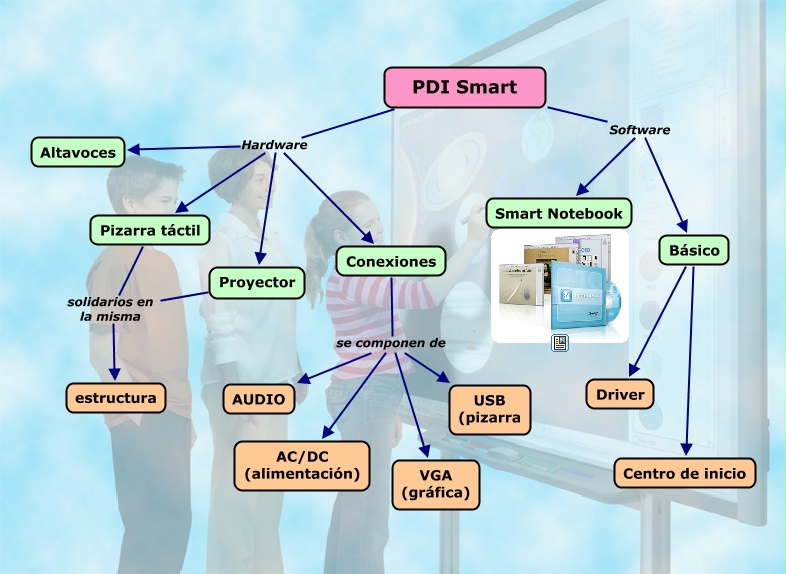 Este Cmap, tiene información relacionada con: PDI Smart, PDI Smart Hardware Proyector, Conexiones se componen de AUDIO, Conexiones se componen de VGA (gráfica), Conexiones se componen de USB (pizarra, PDI Smart Hardware Pizarra táctil, PDI Smart Software Básico, Básico Centro de inicio, PDI Smart Hardware Altavoces, PDI Smart Hardware Conexiones, Básico Driver, Proyector solidarios en la misma estructura, Conexiones se componen de AC/DC (alimentación), Pizarra táctil solidarios en la misma estructura, PDI Smart Software Smart Notebook