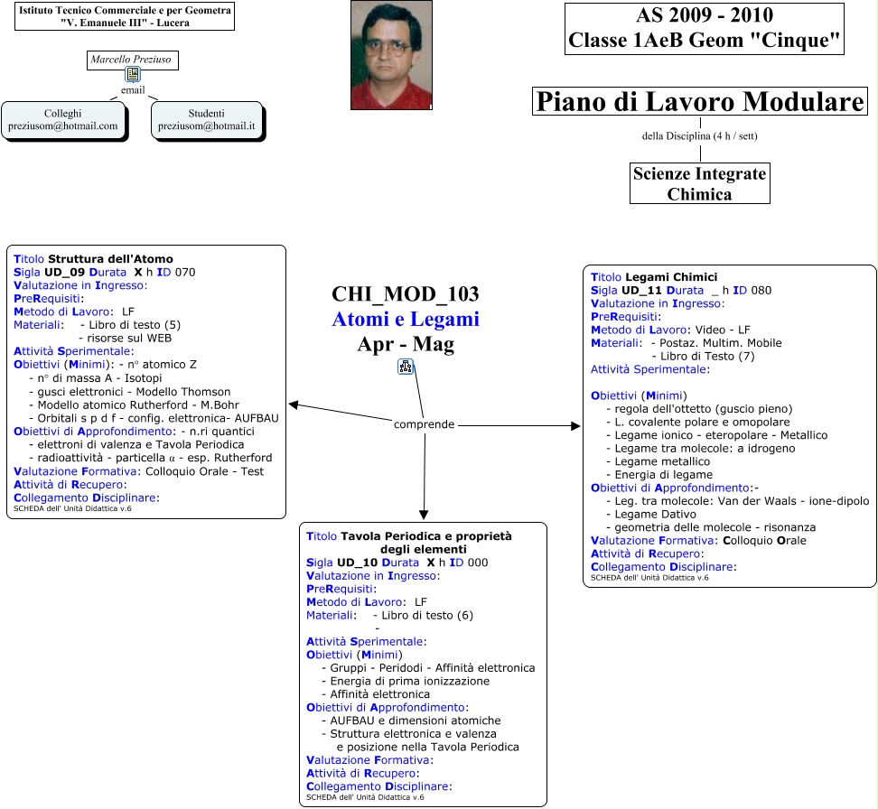 Questa Cmap, creata con IHMC CmapTools, contiene informazioni relative a: CHI_MOD_103 Atomi e Legami, CHI_MOD_103 Atomi e Legami Apr - Mag comprende Titolo Struttura dell'Atomo Sigla UD_09 Durata X h ID 070 Valutazione in Ingresso: PreRequisiti: Metodo di Lavoro: LF Materiali: - Libro di testo (5) - risorse sul WEB Attività Sperimentale: Obiettivi (Minimi): - n° atomico Z - n° di massa A - Isotopi - gusci elettronici - Modello Thomson - Modello atomico Rutherford - M.Bohr - Orbitali s p d f - config. elettronica- AUFBAU Obiettivi di Approfondimento: - n.ri quantici - elettroni di valenza e Tavola Periodica - radioattività - particella α - esp. Rutherford Valutazione Formativa: Colloquio Orale - Test Attività di Recupero: Collegamento Disciplinare: SCHEDA dell' Unità Didattica v.6, Marcello Preziuso email Colleghi preziusom@hotmail.com, CHI_MOD_103 Atomi e Legami Apr - Mag comprende Titolo Legami Chimici Sigla UD_11 Durata _ h ID 080 Valutazione in Ingresso: PreRequisiti: Metodo di Lavoro: Video - LF Materiali: - Postaz. Multim. Mobile - Libro di Testo (7) Attività Sperimentale: Obiettivi (Minimi) - regola dell'ottetto (guscio pieno) - L. covalente polare e omopolare - Legame ionico - eteropolare - Metallico - Legame tra molecole: a idrogeno - Legame metallico - Energia di legame Obiettivi di Approfondimento:- - Leg. tra molecole: Van der Waals - ione-dipolo - Legame Dativo - geometria delle molecole - risonanza Valutazione Formativa: Colloquio Orale Attività di Recupero: Collegamento Disciplinare: SCHEDA dell' Unità Didattica v.6, Piano di Lavoro Modulare della Disciplina (4 h / sett) Scienze Integrate Chimica, Marcello Preziuso email Studenti preziusom@hotmail.it, CHI_MOD_103 Atomi e Legami Apr - Mag comprende Titolo Tavola Periodica e proprietà degli elementi Sigla UD_10 Durata X h ID 000 Valutazione in Ingresso: PreRequisiti: Metodo di Lavoro: LF Materiali: - Libro di testo (6) - Attività Sperimentale: Obiettivi (Minimi) - Gruppi - Peridodi - Affinità elettronica - Energia di prima ionizzazione - Affinità elettronica Obiettivi di Approfondimento: - AUFBAU e dimensioni atomiche - Struttura elettronica e valenza e posizione nella Tavola Periodica Valutazione Formativa: Attività di Recupero: Collegamento Disciplinare: SCHEDA dell' Unità Didattica v.6