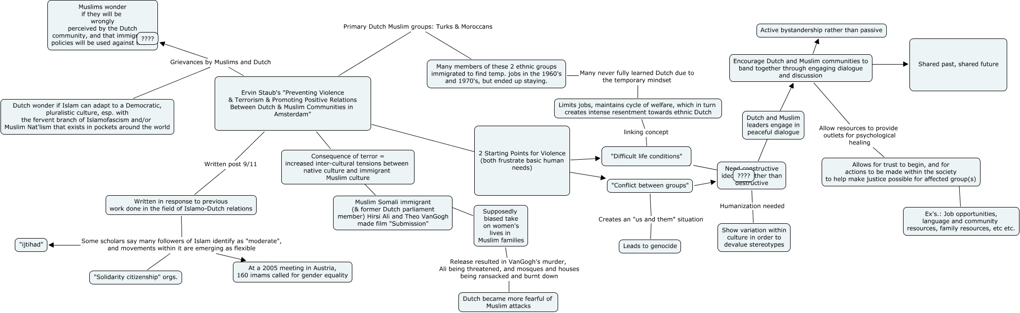 This Concept Map, created with IHMC CmapTools, has information related to: Preventing Violence...Between Dutch and Muslim Communities - Staub, Ervin Staub's "Preventing Violence & Terrorism & Promoting Positive Relations Between Dutch & Muslim Communities in Amsterdam" Muslim Somali immigrant (& former Dutch parliament member) Hirsi Ali and Theo VanGogh made film "Submission", Allows for trust to begin, and for actions to be made within the society to help make justice possible for affected group(s) ???? Ex's.: Job opportunities, language and community resources, family resources, etc etc., 2 Starting Points for Violence (both frustrate basic human needs) ???? "Difficult life conditions", Limits jobs, maintains cycle of welfare, which in turn creates intense resentment towards ethnic Dutch linking concept "Difficult life conditions", Encourage Dutch and Muslim communities to band together through engaging dialogue and discussion ???? Active bystandership rather than passive, "Conflict between groups" Creates an "us and them" situation Leads to genocide, Muslim Somali immigrant (& former Dutch parliament member) Hirsi Ali and Theo VanGogh made film "Submission" ???? Supposedly biased take on women's lives in Muslim families, Ervin Staub's "Preventing Violence & Terrorism & Promoting Positive Relations Between Dutch & Muslim Communities in Amsterdam" Grievances by Muslims and Dutch ????, Ervin Staub's "Preventing Violence & Terrorism & Promoting Positive Relations Between Dutch & Muslim Communities in Amsterdam" Written post 9/11 Written in response to previous work done in the field of Islamo-Dutch relations, "Difficult life conditions" ???? ????, Need constructive ideology rather than destructive Humanization needed Show variation within culture in order to devalue stereotypes, "Conflict between groups" Need constructive ideology rather than destructive, Ervin Staub's "Preventing Violence & Terrorism & Promoting Positive Relations Between Dutch & Muslim Communities in Amsterdam" Grievances by Muslims and Dutch Dutch wonder if Islam can adapt to a Democratic, pluralistic culture, esp. with the fervent branch of Islamofascism and/or Muslim Nat'lism that exists in pockets around the world, Encourage Dutch and Muslim communities to band together through engaging dialogue and discussion Allow resources to provide outlets for psychological healing Allows for trust to begin, and for actions to be made within the society to help make justice possible for affected group(s), Need constructive ideology rather than destructive Encourage Dutch and Muslim communities to band together through engaging dialogue and discussion, Ervin Staub's "Preventing Violence & Terrorism & Promoting Positive Relations Between Dutch & Muslim Communities in Amsterdam" Primary Dutch Muslim groups: Turks & Moroccans Many members of these 2 ethnic groups immigrated to find temp. jobs in the 1960's and 1970's, but ended up staying., Supposedly biased take on women's lives in Muslim families Release resulted in VanGogh's murder, Ali being threatened, and mosques and houses being ransacked and burnt down Dutch became more fearful of Muslim attacks, Ervin Staub's "Preventing Violence & Terrorism & Promoting Positive Relations Between Dutch & Muslim Communities in Amsterdam" "Conflict between groups", Written in response to previous work done in the field of Islamo-Dutch relations Some scholars say many followers of Islam identify as "moderate", and movements within it are emerging as flexible At a 2005 meeting in Austria, 160 imams called for gender equality, Written in response to previous work done in the field of Islamo-Dutch relations Some scholars say many followers of Islam identify as "moderate", and movements within it are emerging as flexible "ijtihad"