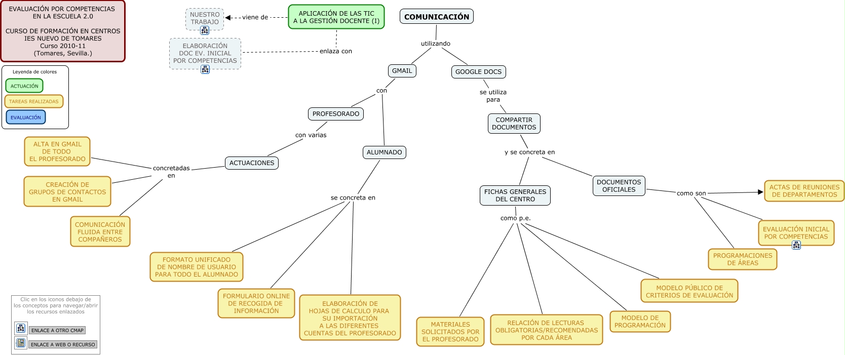 Este Cmap, tiene información relacionada con: Cmap1_Comunicación, ACTUACIONES concretadas en COMUNICACIÓN FLUIDA ENTRE COMPAÑEROS, FICHAS GENERALES DEL CENTRO como p.e. MODELO PÚBLICO DE CRITERIOS DE EVALUACIÓN, APLICACIÓN DE LAS TIC A LA GESTIÓN DOCENTE (I) viene de NUESTRO TRABAJO, APLICACIÓN DE LAS TIC A LA GESTIÓN DOCENTE (I) enlaza con ELABORACIÓN DOC EV. INICIAL POR COMPETENCIAS, COMUNICACIÓN utilizando GOOGLE DOCS, GOOGLE DOCS se utiliza para COMPARTIR DOCUMENTOS, COMPARTIR DOCUMENTOS y se concreta en DOCUMENTOS OFICIALES, GMAIL con PROFESORADO, DOCUMENTOS OFICIALES como son ACTAS DE REUNIONES DE DEPARTAMENTOS, DOCUMENTOS OFICIALES como son PROGRAMACIONES DE ÁREAS, ACTUACIONES concretadas en CREACIÓN DE GRUPOS DE CONTACTOS EN GMAIL, ALUMNADO se concreta en ELABORACIÓN DE HOJAS DE CALCULO PARA SU IMPORTACIÓN A LAS DIFERENTES CUENTAS DEL PROFESORADO, FICHAS GENERALES DEL CENTRO como p.e. MODELO DE PROGRAMACIÓN, ACTUACIONES concretadas en ALTA EN GMAIL DE TODO EL PROFESORADO, COMPARTIR DOCUMENTOS y se concreta en FICHAS GENERALES DEL CENTRO, COMUNICACIÓN utilizando GMAIL, FICHAS GENERALES DEL CENTRO como p.e. MATERIALES SOLICITADOS POR EL PROFESORADO, PROFESORADO con varias ACTUACIONES, ALUMNADO se concreta en FORMATO UNIFICADO DE NOMBRE DE USUARIO PARA TODO EL ALUMNADO, ALUMNADO se concreta en FORMULARIO ONLINE DE RECOGIDA DE INFORMACIÓN
