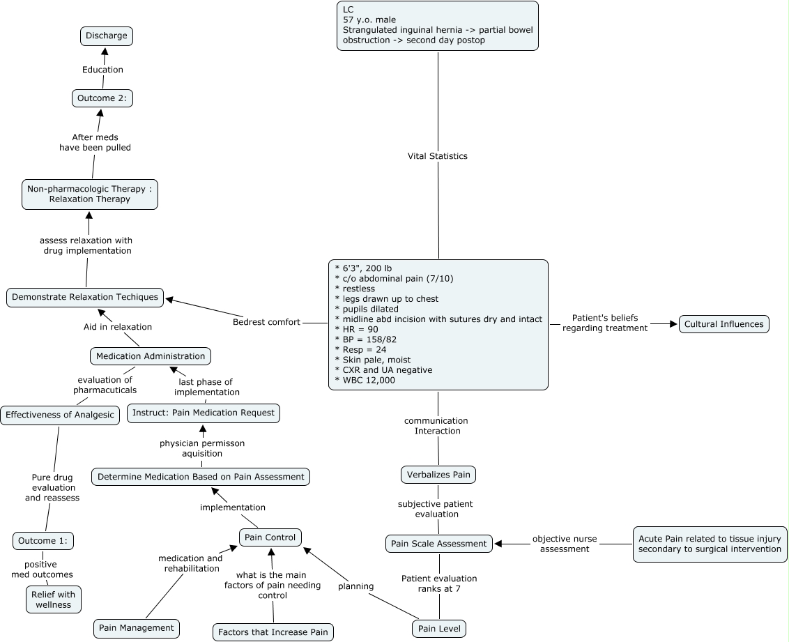 This Concept Map, created with IHMC CmapTools, has information related to: Acute Care, York, Pain Level planning Pain Control, Medication Administration Aid in relaxation Demonstrate Relaxation Techiques, Factors that Increase Pain what is the main factors of pain needing control Pain Control, Pain Control implementation Determine Medication Based on Pain Assessment, Medication Administration evaluation of pharmacuticals Effectiveness of Analgesic, Pain Management medication and rehabilitation Pain Control, Effectiveness of Analgesic Pure drug evaluation and reassess Outcome 1:, Determine Medication Based on Pain Assessment physician permisson aquisition Instruct: Pain Medication Request, Instruct: Pain Medication Request last phase of implementation Medication Administration, Non-pharmacologic Therapy : Relaxation Therapy After meds have been pulled Outcome 2:, Verbalizes Pain subjective patient evaluation Pain Scale Assessment, Outcome 2: Education Discharge, Demonstrate Relaxation Techiques assess relaxation with drug implementation Non-pharmacologic Therapy : Relaxation Therapy, * 6'3", 200 lb * c/o abdominal pain (7/10) * restless * legs drawn up to chest * pupils dilated * midline abd incision with sutures dry and intact * HR = 90 * BP = 158/82 * Resp = 24 * Skin pale, moist * CXR and UA negative * WBC 12,000 Bedrest comfort Demonstrate Relaxation Techiques, * 6'3", 200 lb * c/o abdominal pain (7/10) * restless * legs drawn up to chest * pupils dilated * midline abd incision with sutures dry and intact * HR = 90 * BP = 158/82 * Resp = 24 * Skin pale, moist * CXR and UA negative * WBC 12,000 communication Interaction Verbalizes Pain, Acute Pain related to tissue injury secondary to surgical intervention objective nurse assessment Pain Scale Assessment, LC 57 y.o. male Strangulated inguinal hernia -> partial bowel obstruction -> second day postop Vital Statistics * 6'3", 200 lb * c/o abdominal pain (7/10) * restless * legs drawn up to chest * pupils dilated * midline abd incision with sutures dry and intact * HR = 90 * BP = 158/82 * Resp = 24 * Skin pale, moist * CXR and UA negative * WBC 12,000, Outcome 1: positive med outcomes Relief with wellness, Pain Scale Assessment Patient evaluation ranks at 7 Pain Level, * 6'3", 200 lb * c/o abdominal pain (7/10) * restless * legs drawn up to chest * pupils dilated * midline abd incision with sutures dry and intact * HR = 90 * BP = 158/82 * Resp = 24 * Skin pale, moist * CXR and UA negative * WBC 12,000 Patient's beliefs regarding treatment Cultural Influences
