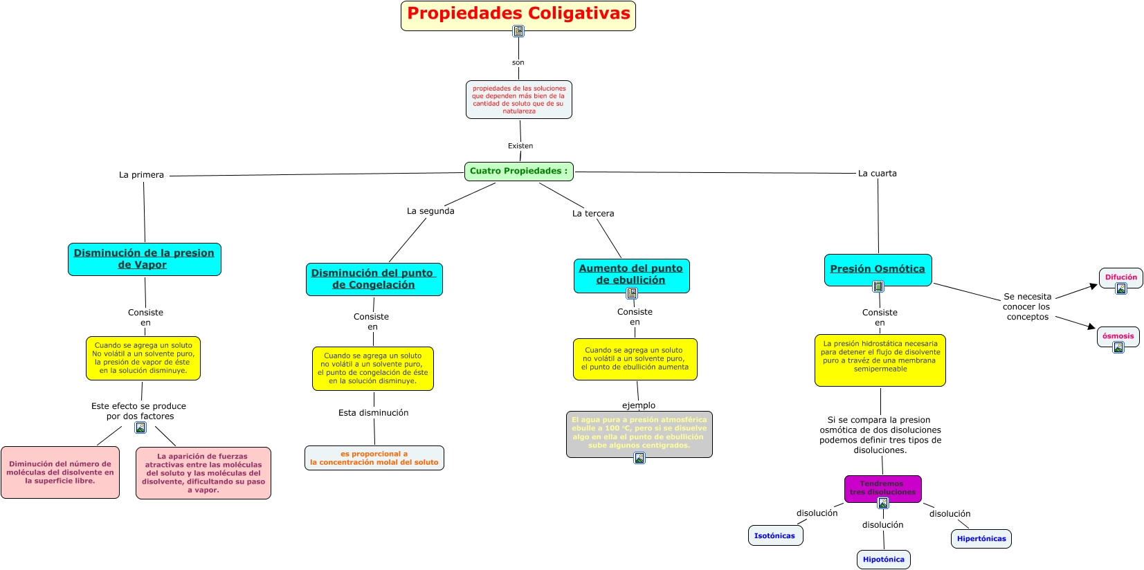 Este Cmap, tiene información relacionada con: Propiedades Coligativas, Propiedades Coligativas son propiedades de las soluciones que dependen más bien de la cantidad de soluto que de su natulareza, Presión Osmótica Consiste en La presión hidrostática necesaria para detener el flujo de disolvente puro a travéz de una membrana semipermeable, Aumento del punto de ebullición Consiste en Cuando se agrega un soluto no volátil a un solvente puro, el punto de ebullición aumenta, Tendremos tres disoluciones disolución Hipotónica, Cuatro Propiedades : La cuarta Presión Osmótica, Presión Osmótica Se necesita conocer los conceptos ósmosis, Cuatro Propiedades : La primera Disminución de la presion de Vapor, Cuatro Propiedades : La segunda Disminución del punto de Congelación, Cuatro Propiedades : La tercera Aumento del punto de ebullición, Cuando se agrega un soluto no volátil a un solvente puro, el punto de congelación de éste en la solución disminuye. Esta disminución es proporcional a la concentración molal del soluto, Cuando se agrega un soluto No volátil a un solvente puro, la presión de vapor de éste en la solución disminuye. Este efecto se produce por dos factores La aparición de fuerzas atractivas entre las moléculas del soluto y las moléculas del disolvente, dificultando su paso a vapor., Disminución del punto de Congelación Consiste en Cuando se agrega un soluto no volátil a un solvente puro, el punto de congelación de éste en la solución disminuye., Tendremos tres disoluciones disolución Isotónicas, Cuando se agrega un soluto no volátil a un solvente puro, el punto de ebullición aumenta ejemplo El agua pura a presión atmosférica ebulle a 100 °C, pero si se disuelve algo en ella el punto de ebullición sube algunos centigrados., Presión Osmótica Se necesita conocer los conceptos Difución, Tendremos tres disoluciones disolución Hipertónicas, propiedades de las soluciones que dependen más bien de la cantidad de soluto que de su natulareza Existen Cuatro Propiedades :, Disminución de la presion de Vapor Consiste en Cuando se agrega un soluto No volátil a un solvente puro, la presión de vapor de éste en la solución disminuye., La presión hidrostática necesaria para detener el flujo de disolvente puro a travéz de una membrana semipermeable Si se compara la presion osmótica de dos disoluciones podemos definir tres tipos de disoluciones. Tendremos tres disoluciones, Cuando se agrega un soluto No volátil a un solvente puro, la presión de vapor de éste en la solución disminuye. Este efecto se produce por dos factores Diminución del número de moléculas del disolvente en la superficie libre.